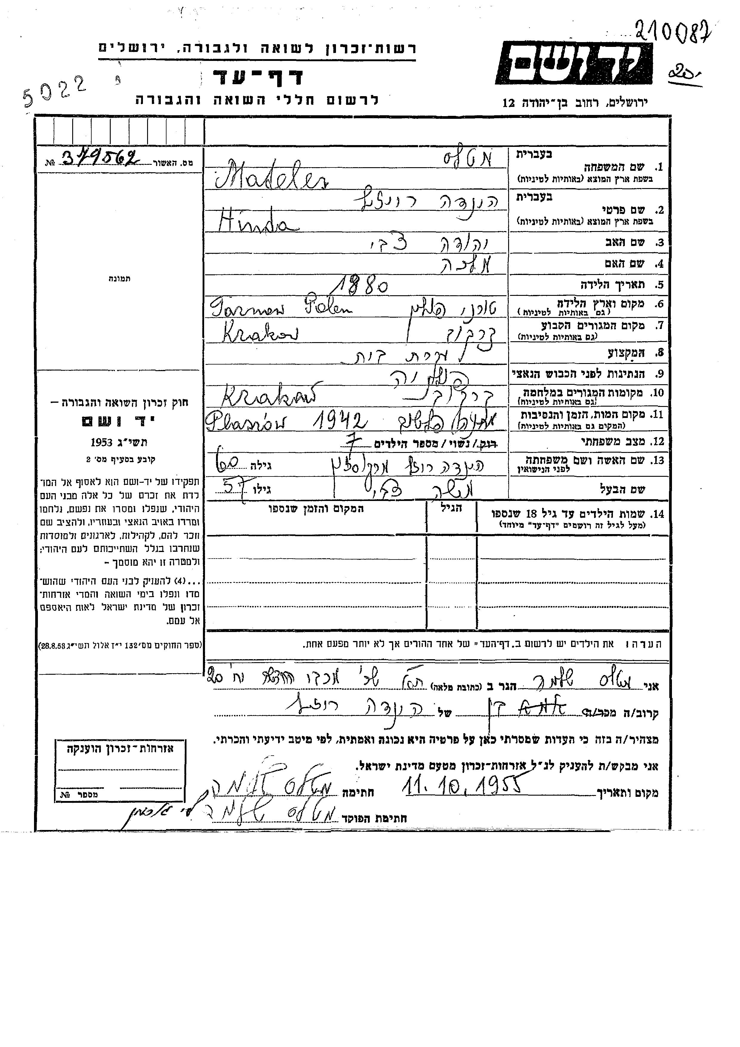 Hinda Reizl Matels nee Markuszon was born in Tarnow, Poland, 1880 to Tzvi Yehuda and Malka. She was a housewife and married to Moshe Tzvi. Prior to WWII she lived in Krakow, Poland. During the war she was in Krakow, Poland. Hinda Reizl was murdered in the Shoah. Place of death: Plaszow, Poland, 1942.