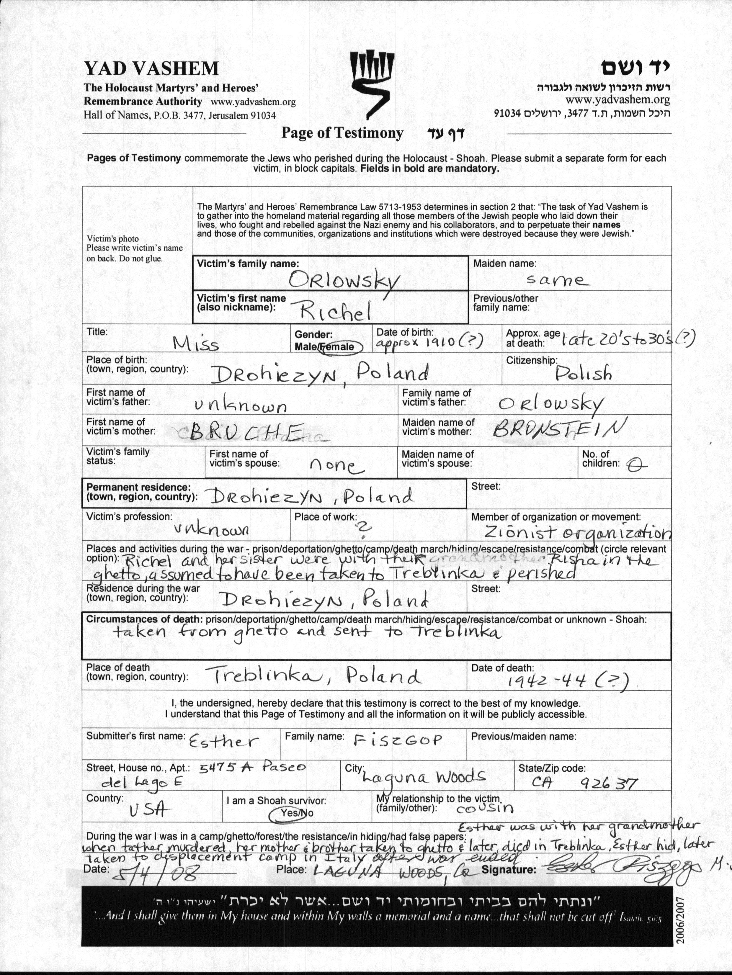 Richel Orlowsky was born in Drohiczyn, Poland, 1910 to Bruche nee Bronstein. Prior to WWII she lived in Drohiczyn, Poland. During the war she was in Drohiczyn (Bialystok), Poland. Richel was murdered in the Shoah. Place of death: Treblinka, Poland, 1942.