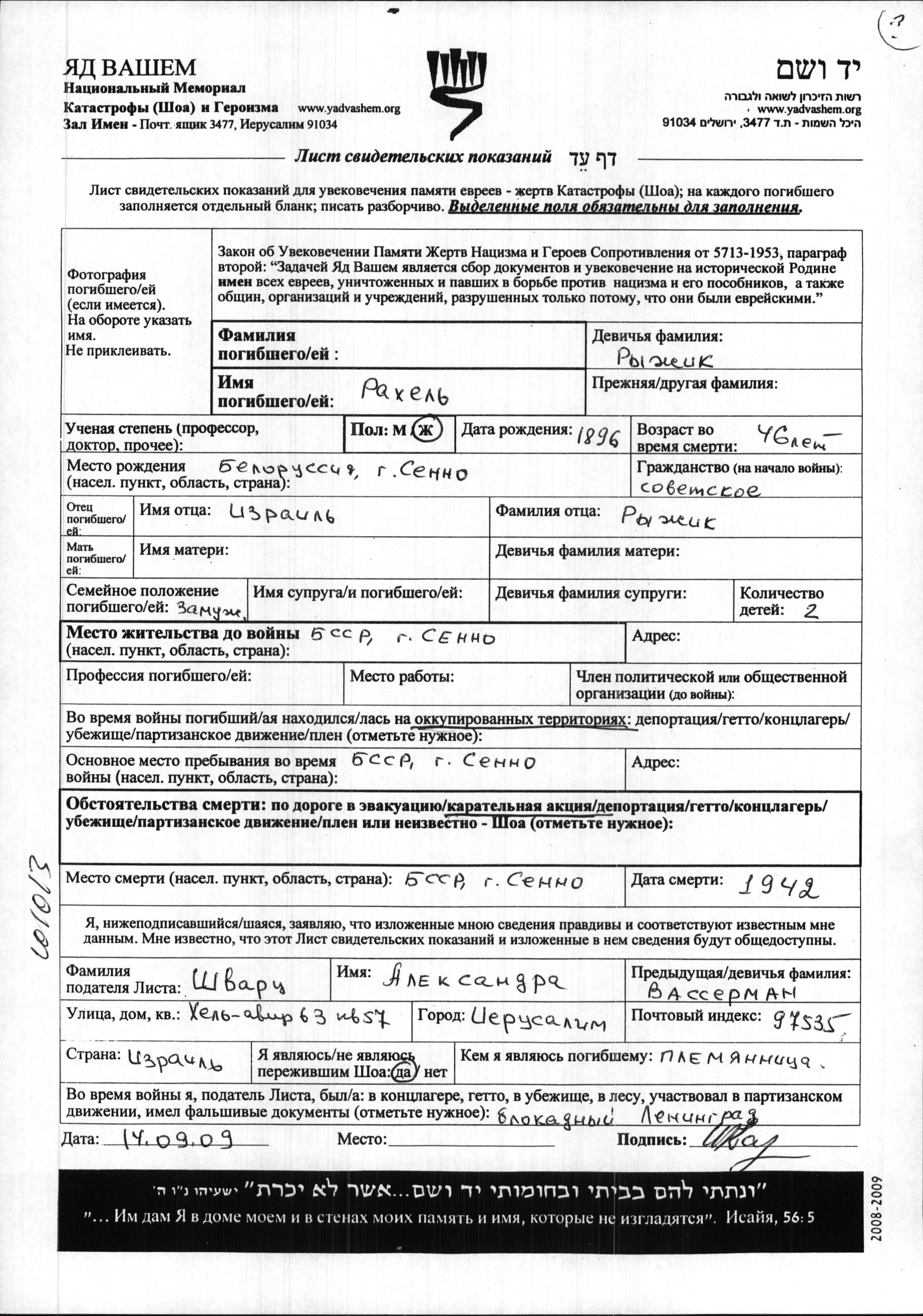 Surname unknown Rakhel 1896 Senno, Belorussia (USSR) Page of Testimony