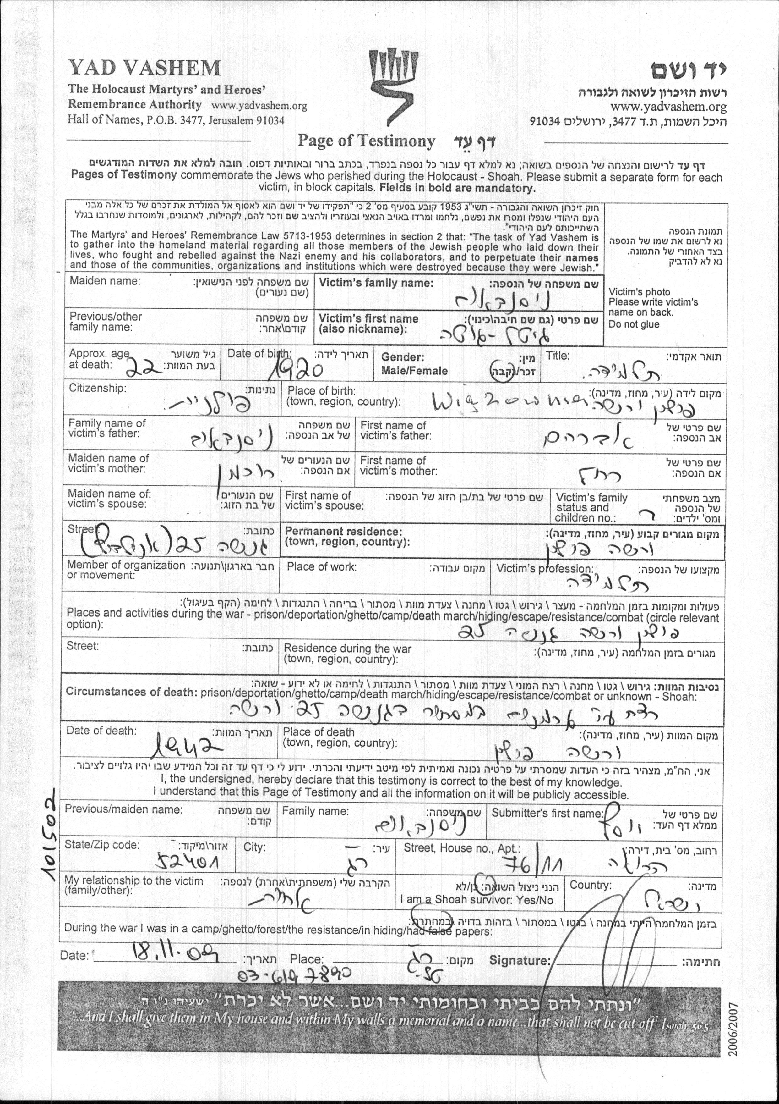 Gitel Nisenbaum was born in Wiazowna, Poland, 1920 to Avraham and Rachel nee Rukhman. She was a pupil and single. Prior to WWII she lived in Varsha, Poland. Gitel was murdered in the Shoah. Place of death: Warszawa, Poland, 1942.