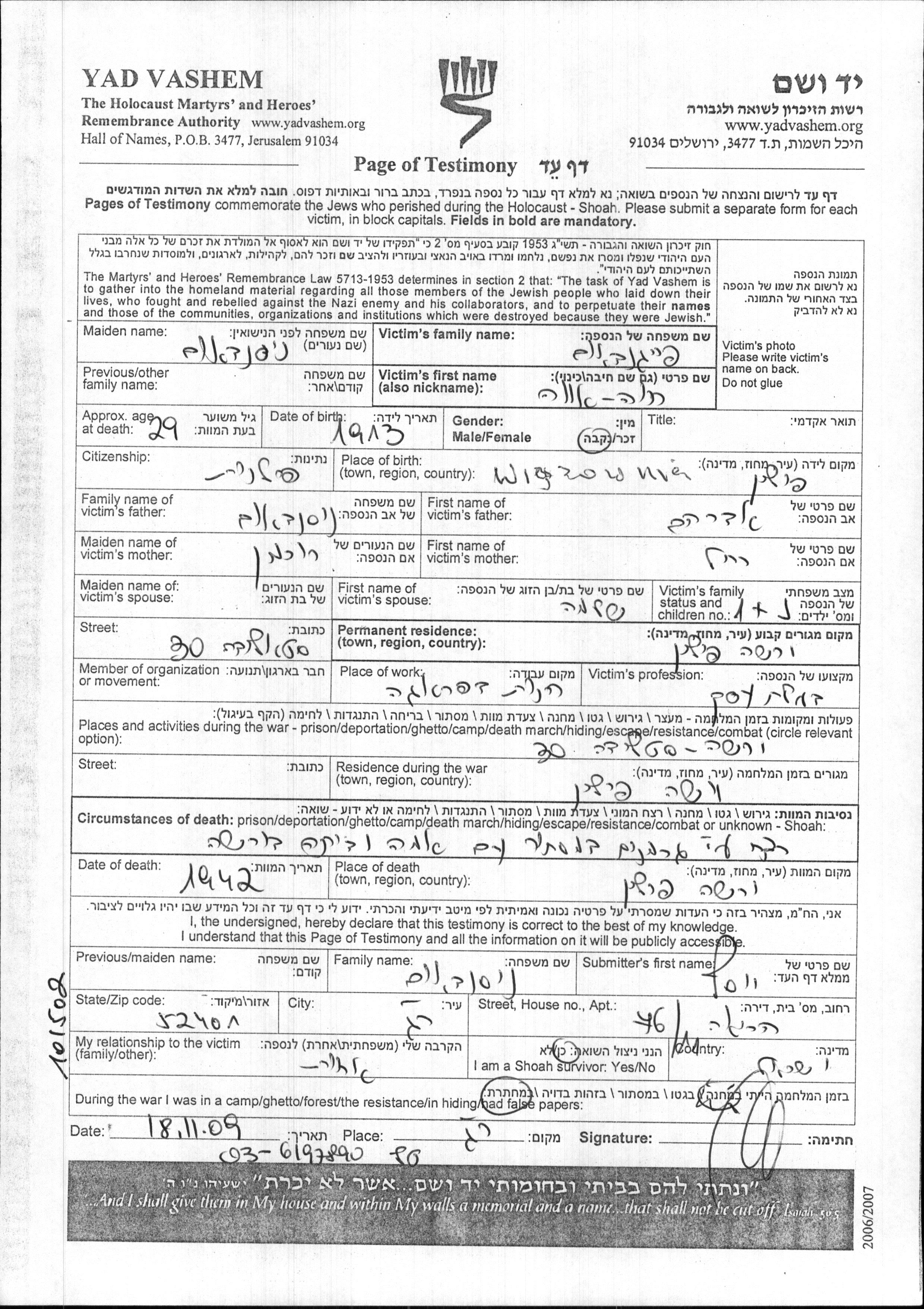 Khava Eva Feigenbaum nee Nisenbaum was born in Wiazowna, Poland, 1913 to Avraham and Rachel nee Rukhman. She was a business owner and married to Shlomo. Prior to WWII she lived in Varsha, Poland. Khava Eva was murdered in the Shoah. Place of death: Varsha, Poland, 1942.