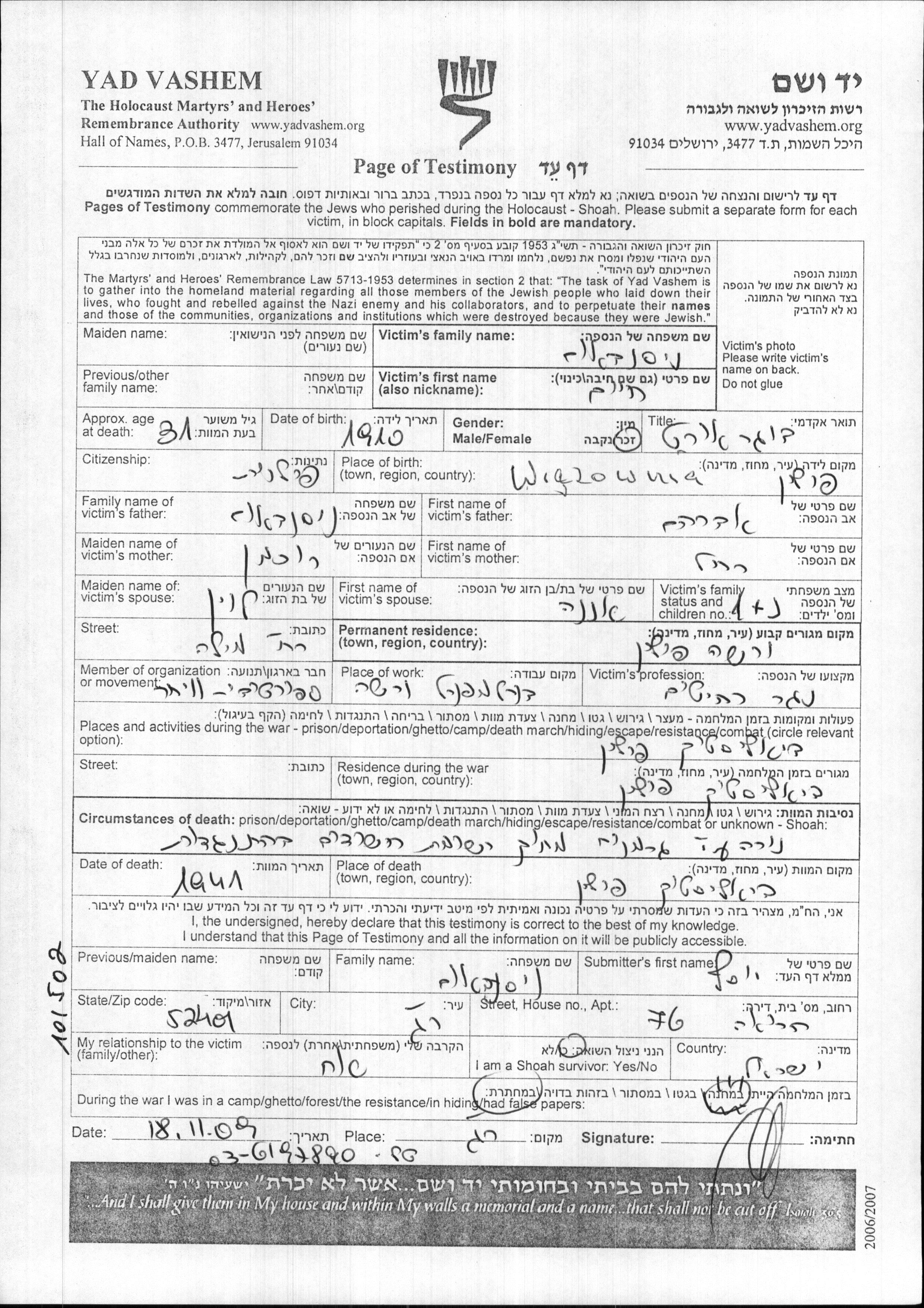 B.a. Chaim Nisenbaum was born in Wiazowna, Poland, 1910 to Avraham and Rachel nee Rukhman. He was a cabinet maker and married to Anna nee Levin. Prior to WWII he lived in Varsha, Poland. During the war he was in Bialystok, Poland. B.a. Nisenbaum was murdered in the Shoah. Place of death: Bialystok, Poland, 1941.