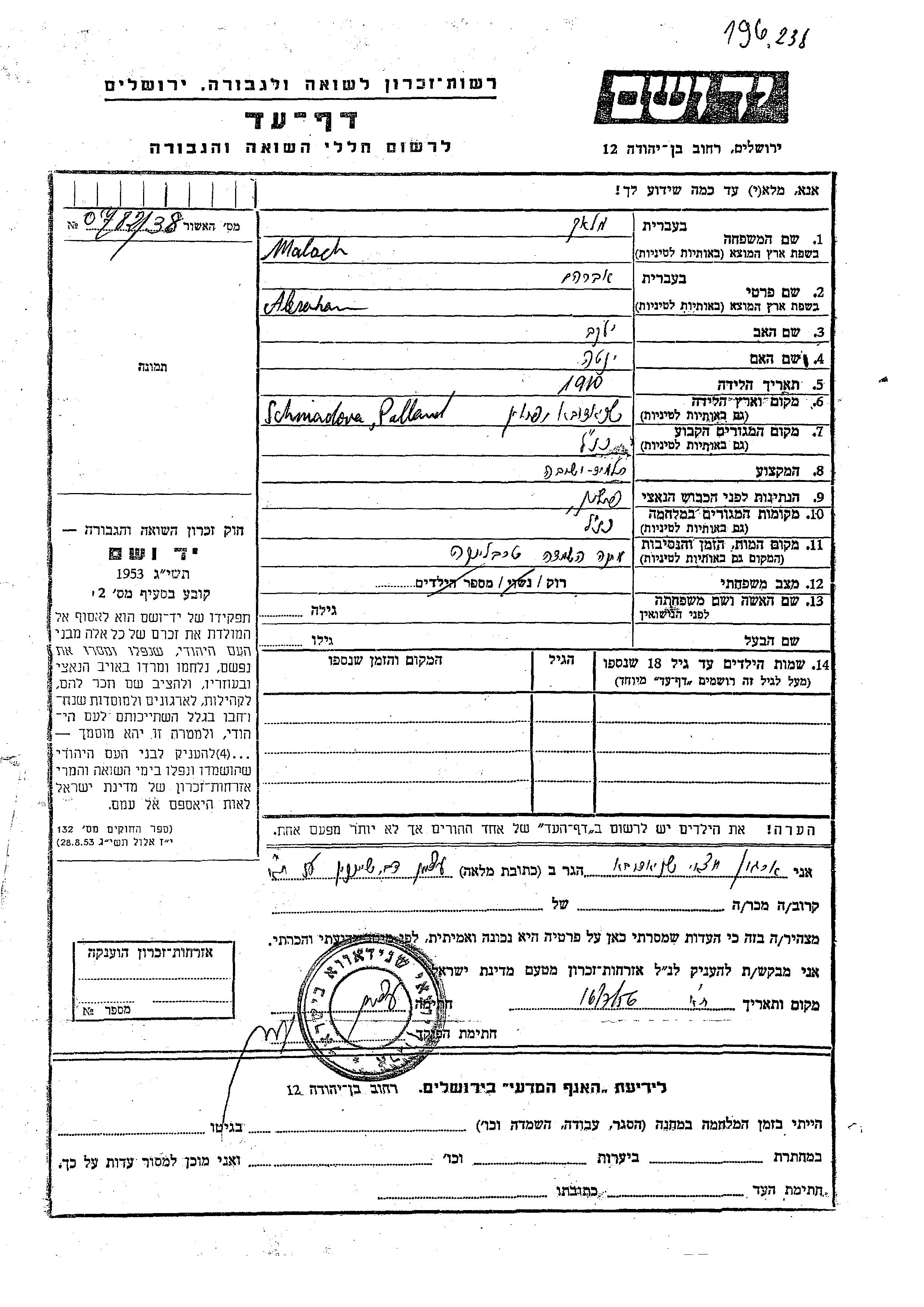Abraham Malach was born in Sniadowo, Poland, 1910 to Yaakov and Yenta. He was a yeshiva student and single. Prior to WWII he lived in Sniadowo, Poland. During the war he was in Sniadowo, Poland. Abraham was murdered in the Shoah. Place of death: Treblinka I, Poland.