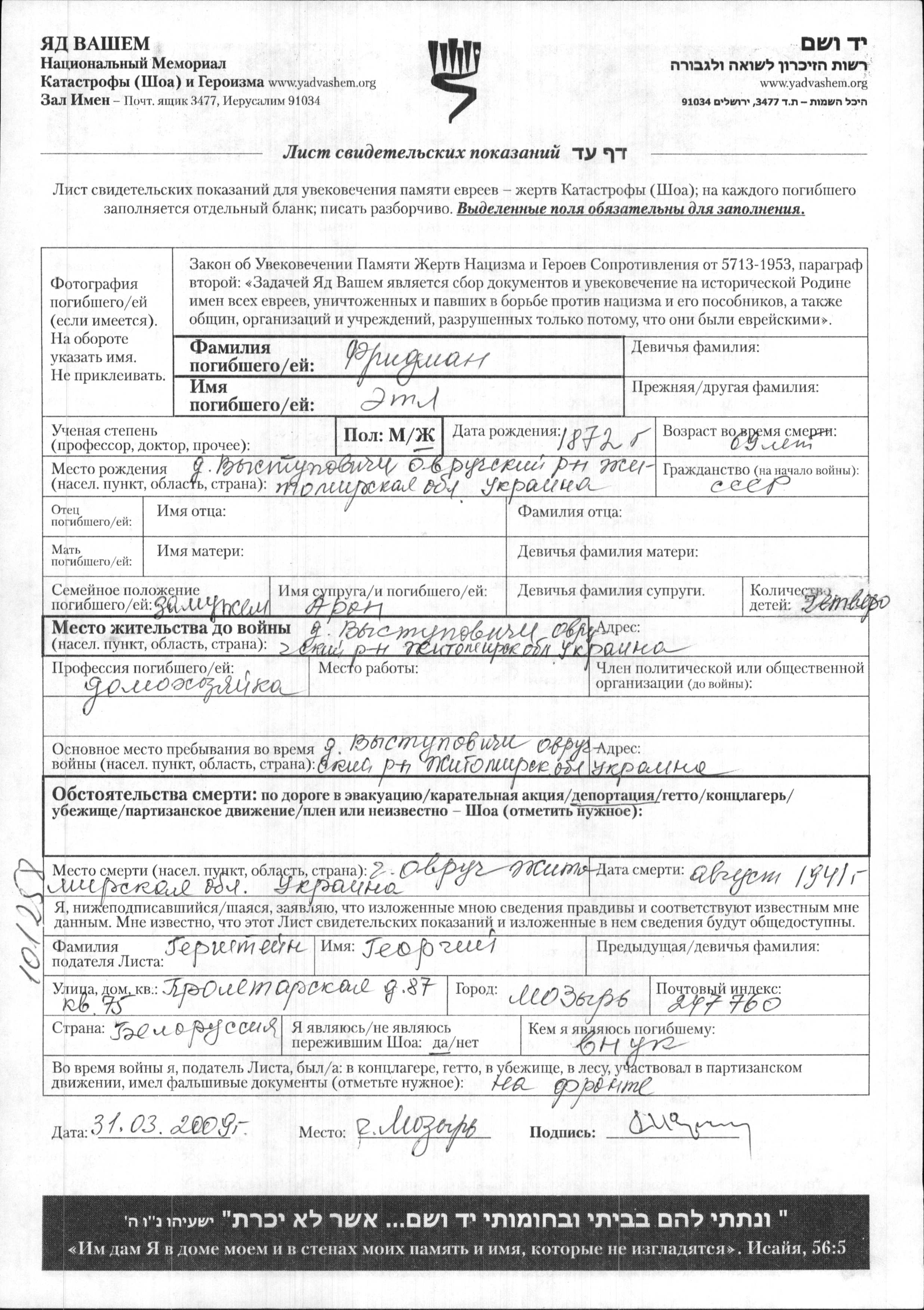Etl Fridman was born in Vystupovichi, Ukraine (USSR), 1872. She was a housewife and married to Aron. Prior to WWII she lived in Vystupovichi, Ukraine (USSR). During the war she was in Vystupovichi, Ukraine (USSR). Etl was murdered in the Shoah. Place of death: Ovruch, Ukraine (USSR), 08/1941.