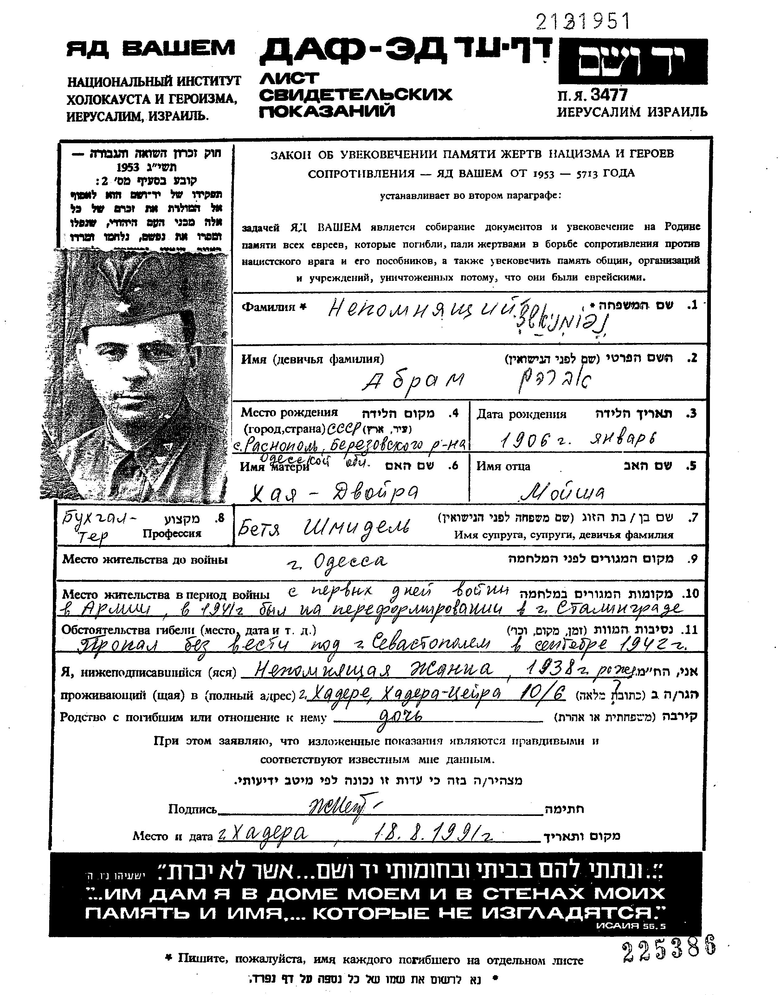 | Nepomnyashchiy | Abram | 1906 | Odessa, Ukraine (USSR) | Page of Testimony |