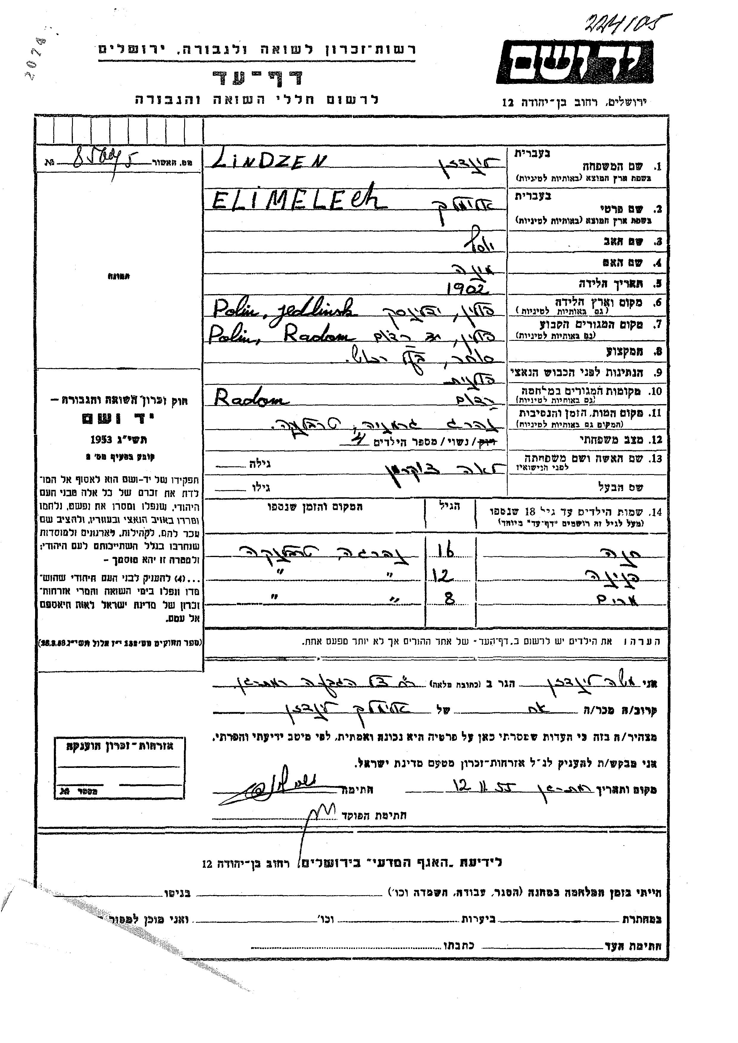 Elimelech Lindzen was born in Jedlinsk, Poland, 1902 to Yosef and Mina. He was a merchant and married to Lea nee Tzukerman. Prior to WWII he lived in Radom, Poland. During the war he was in Radom, Poland. Elimelech was murdered in the Shoah. Place of death: Treblinka, Poland.