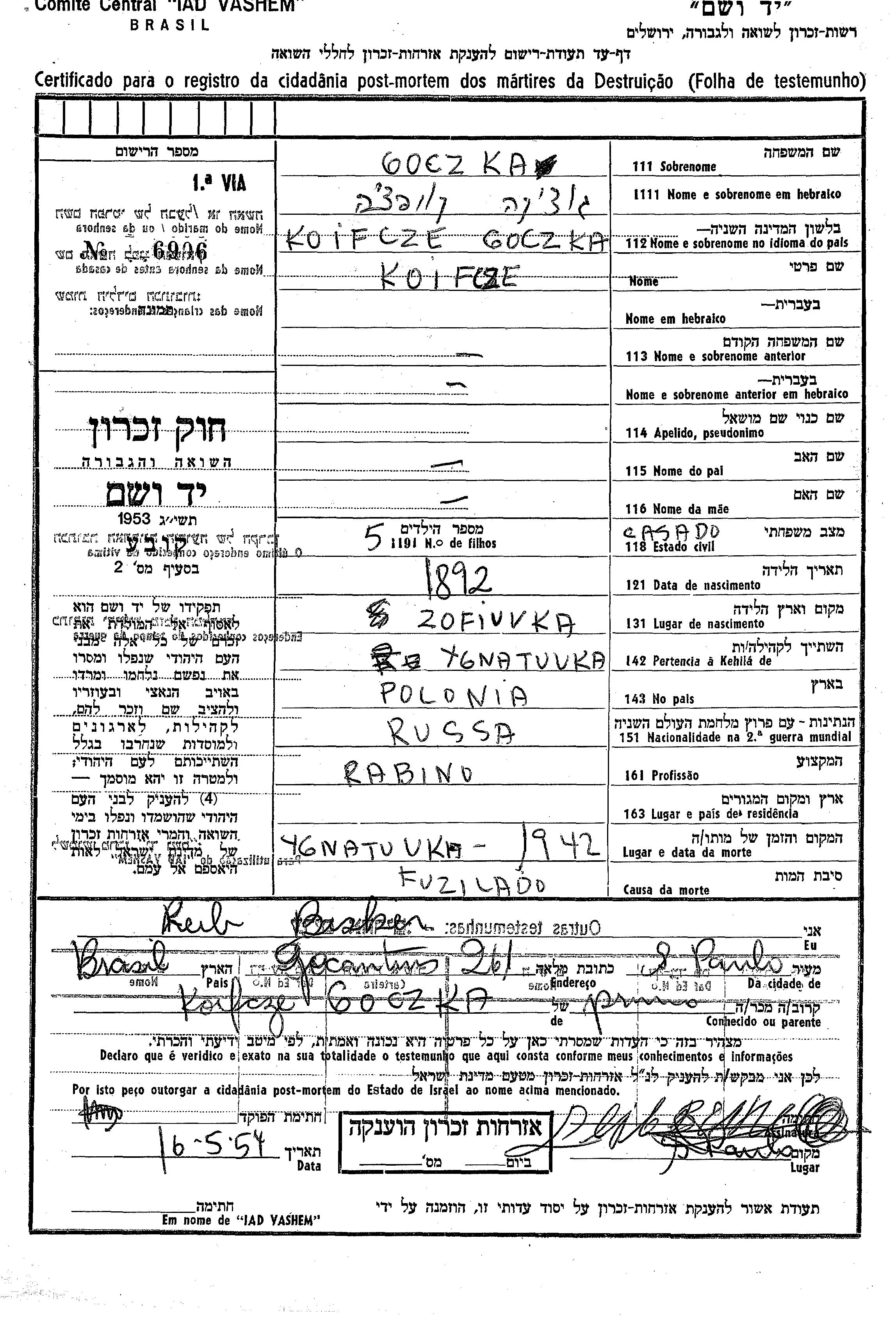 Koifcze was murdered in the Shoah. Place of death: Ygnatuvka, Poland, 1942.
