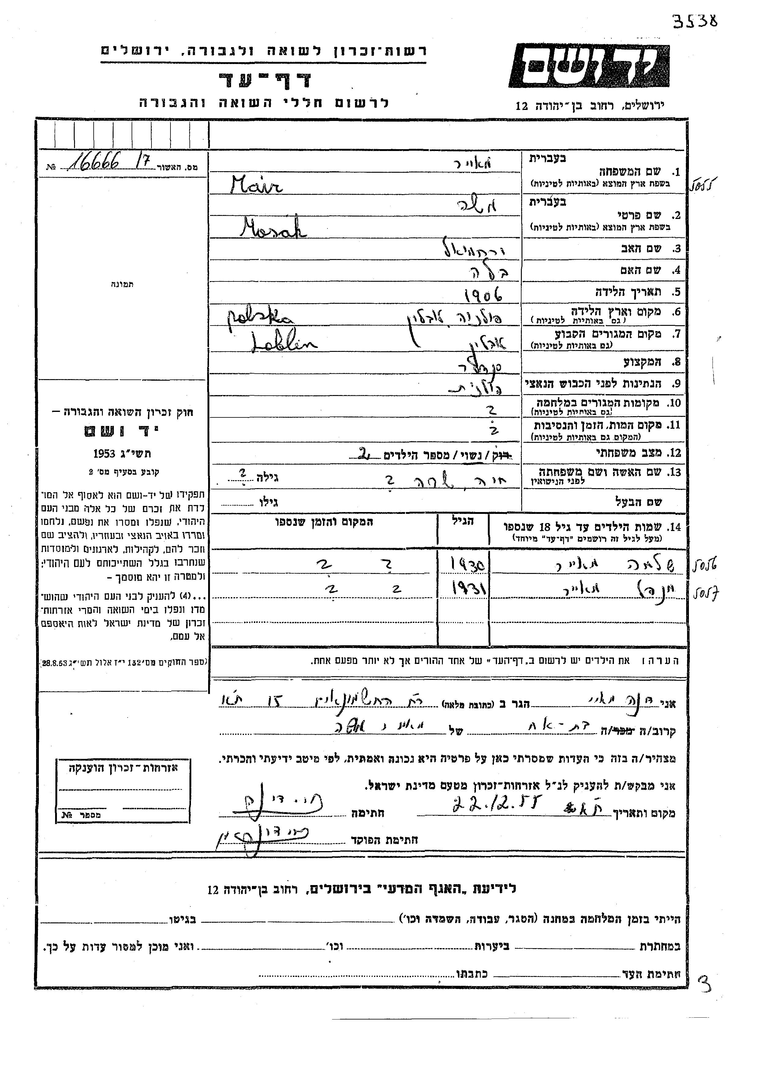 Mair Mendel 1931 Lublin, Poland Page of Testimony