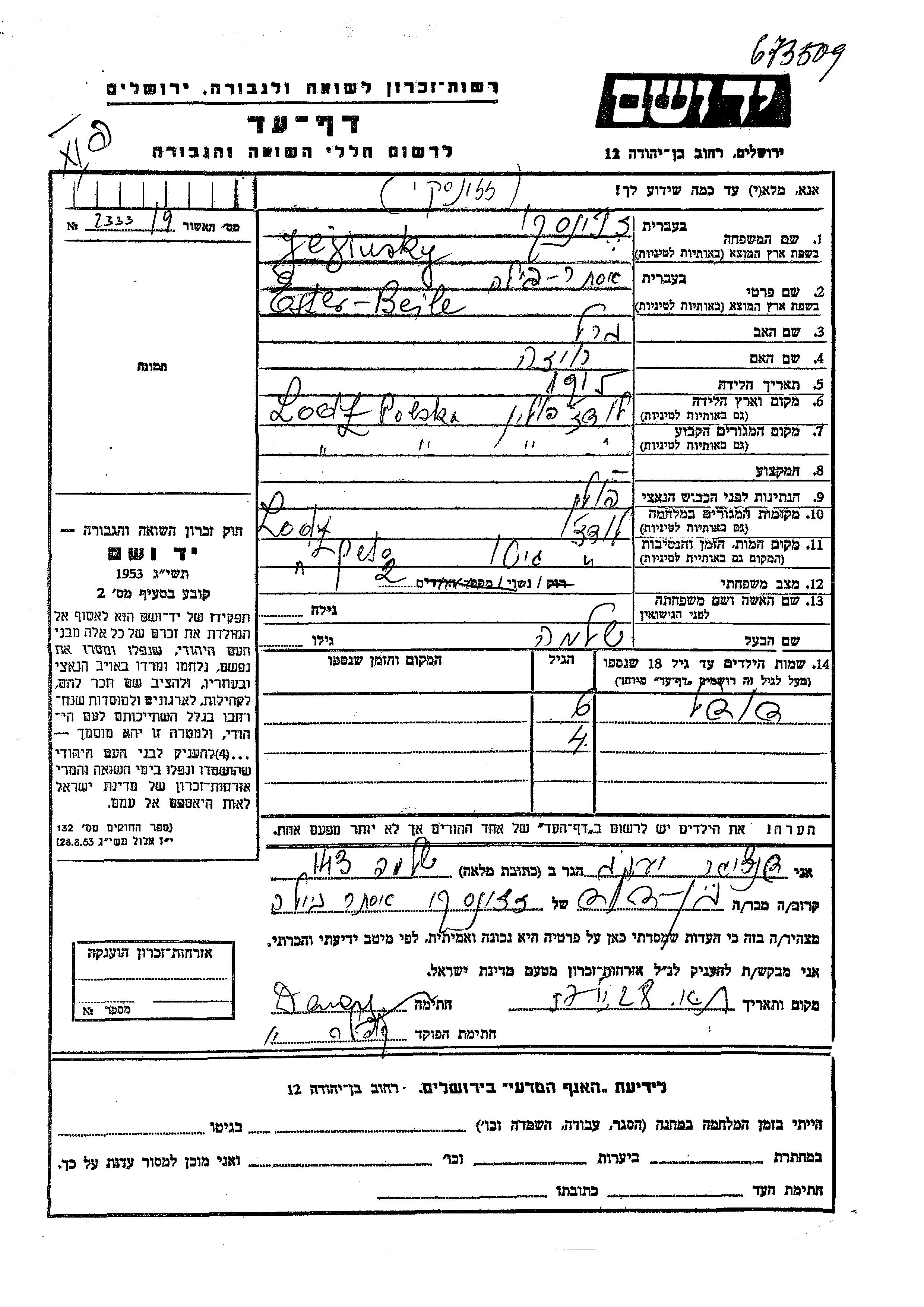 Dudel Jejinsky was born to Shlomo and Beile Ester. He was child. Prior to WWII he lived in Lodz, Poland. During the war he was in Lodz, Poland.