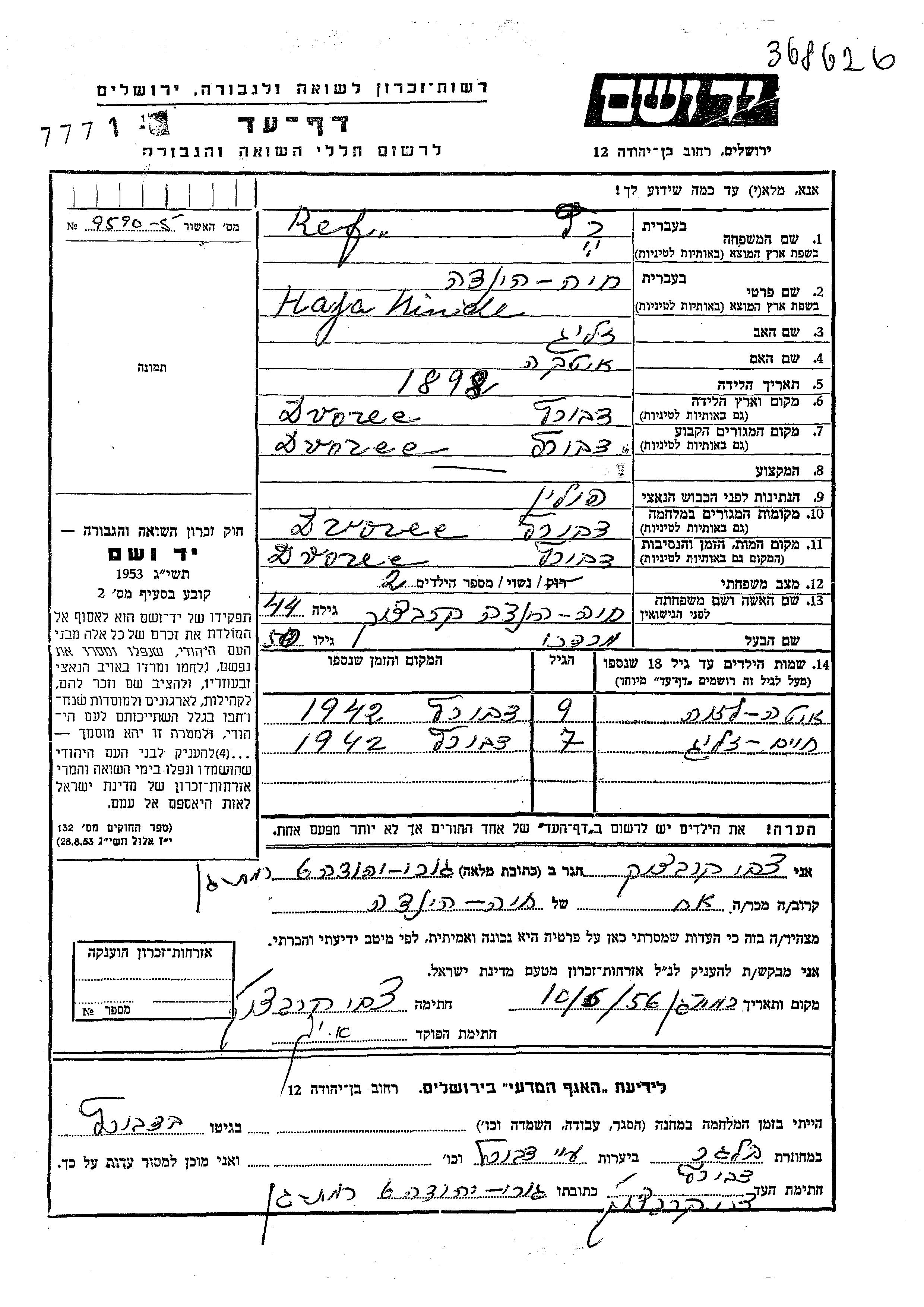 Ita Lea Ref Raf was born to Mordekhai and Haja Hinde nee Kravchik. She was child. Prior to WWII she lived in Dworec, Poland. During the war she was in Dworec, Poland.