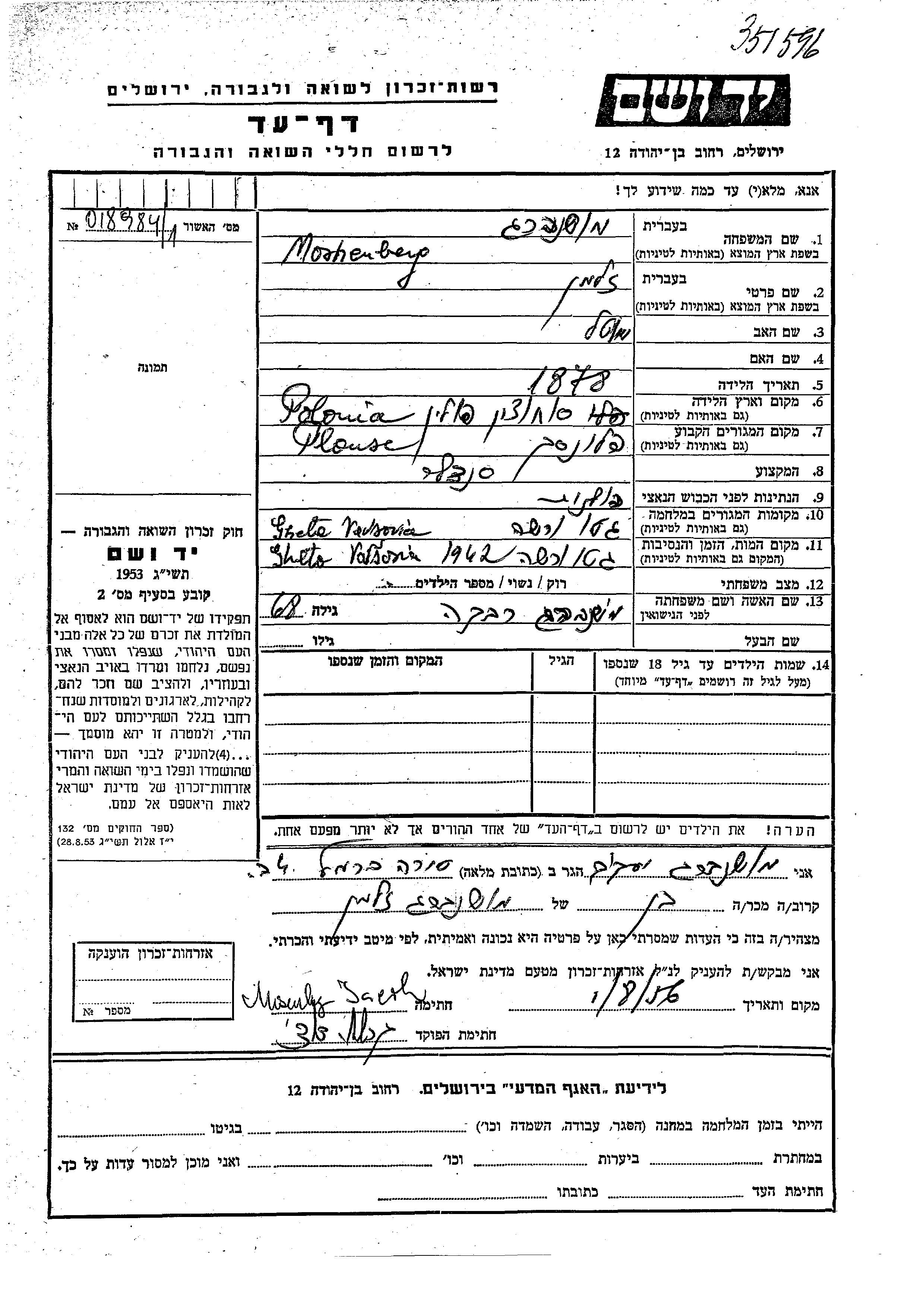 Zalman Moshenberg was born in Sochocin, Poland, 1878 to Motel. He was a shoemaker and married to Rivka. Prior to WWII he lived in Plonsk, Poland. During the war he was in Warszawa, Poland. Zalman was murdered in the Shoah. Place of death: Warszawa, Poland, 1942.