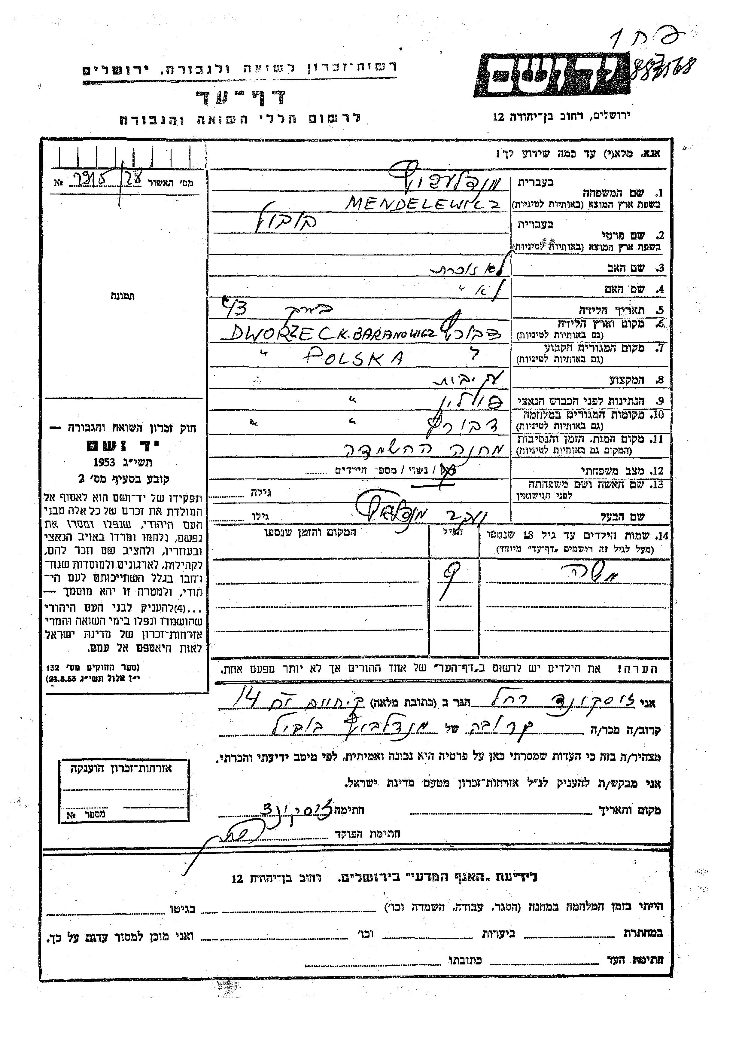 Mendelewicz Moshe Dworzec, Poland Page of Testimony