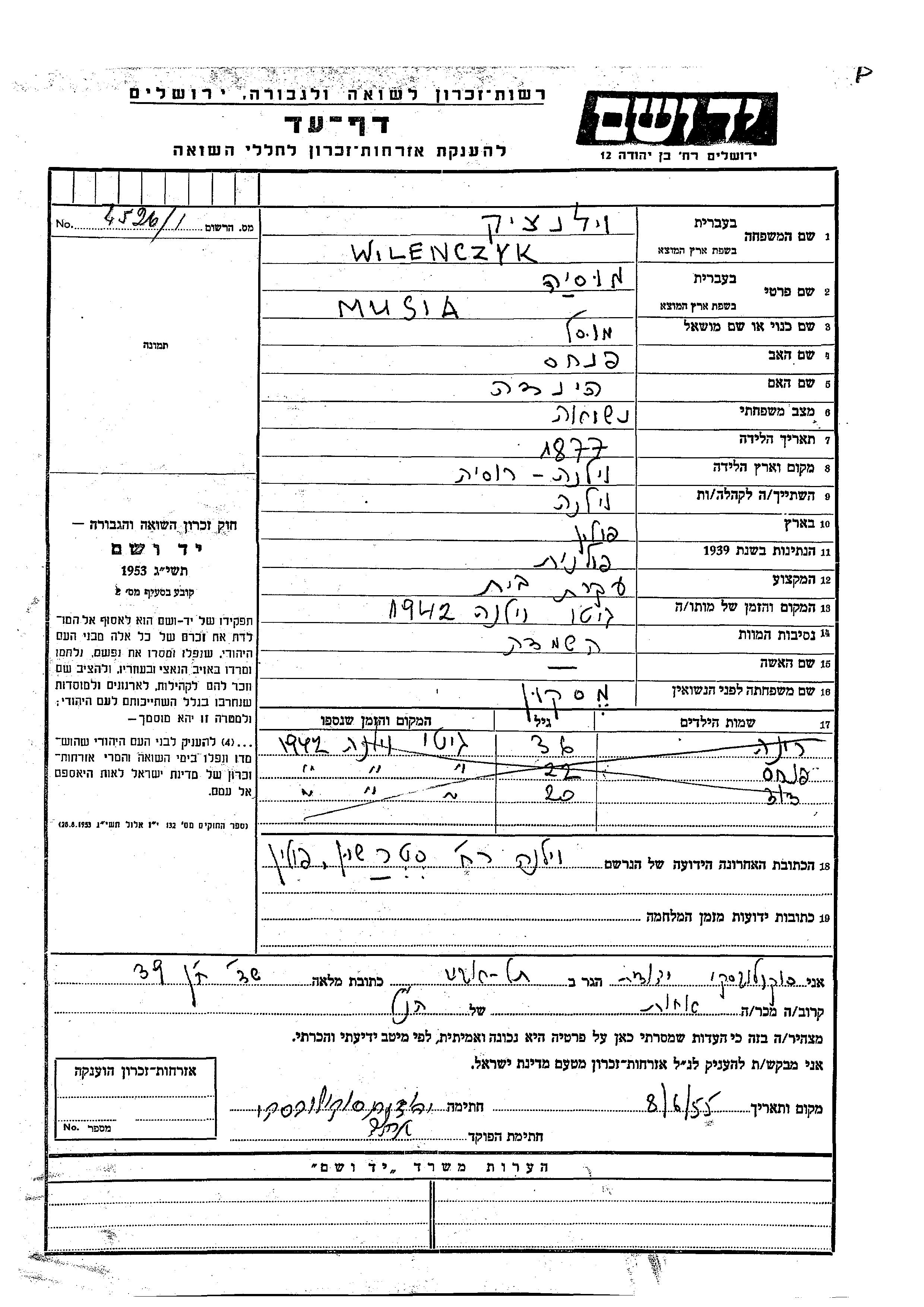 Wilenczyk David unstated place, Page of Testimony