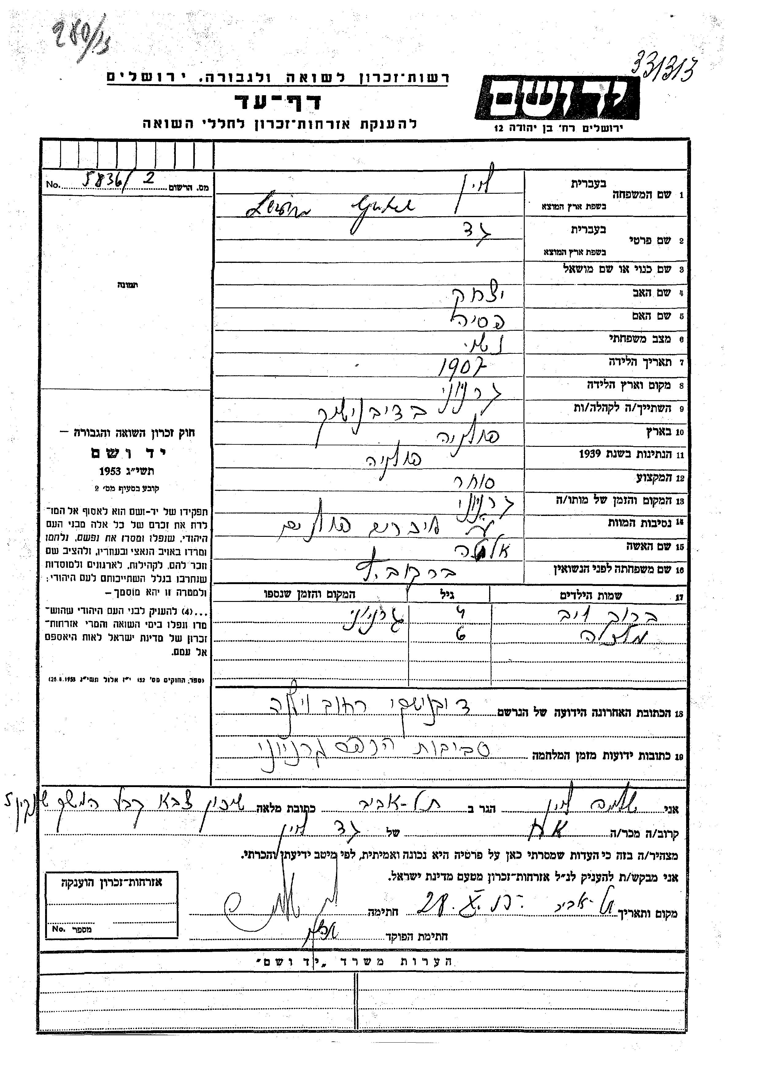 Barukh Leib Lewin was born to Gutel Gad and Alte nee Berkovitz. He was child. Prior to WWII he lived in Dziewieniszki, Poland. During the war he was in Dziewieniszki, Poland. Barukh Leib was murdered in the Shoah.
