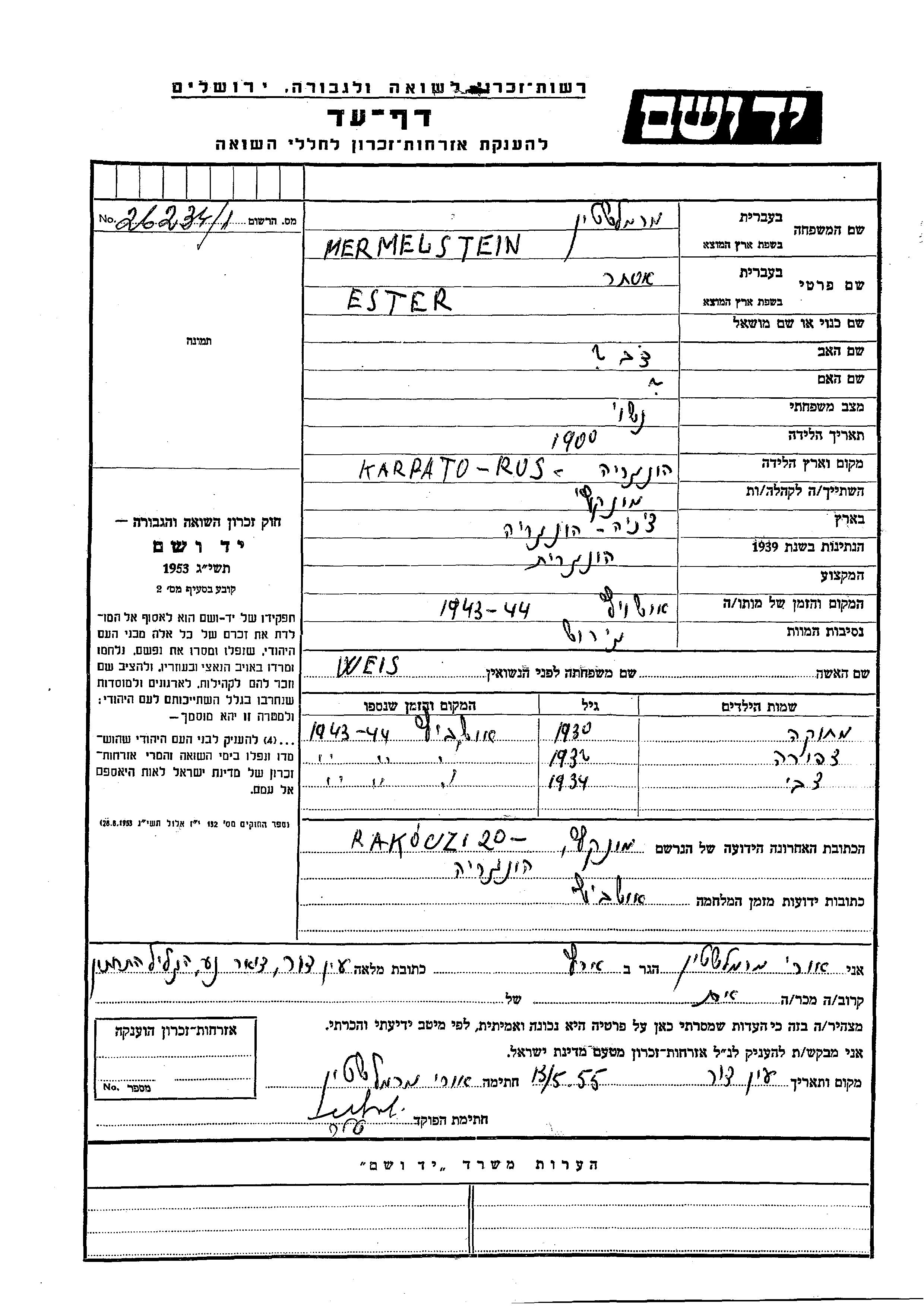 Mermelstein Tzipora 1932 Munkacz, Czechoslovakia Page of Testimony