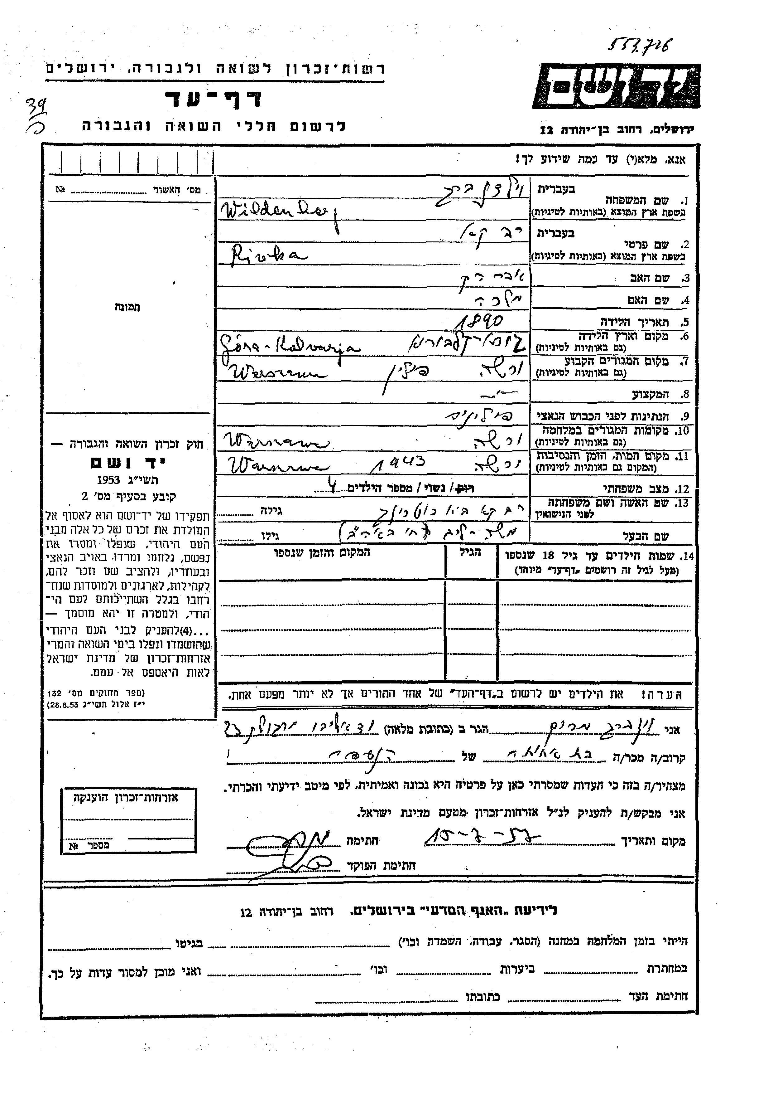 Wildenberg Rivka 1890 Warszawa, Poland Page of Testimony