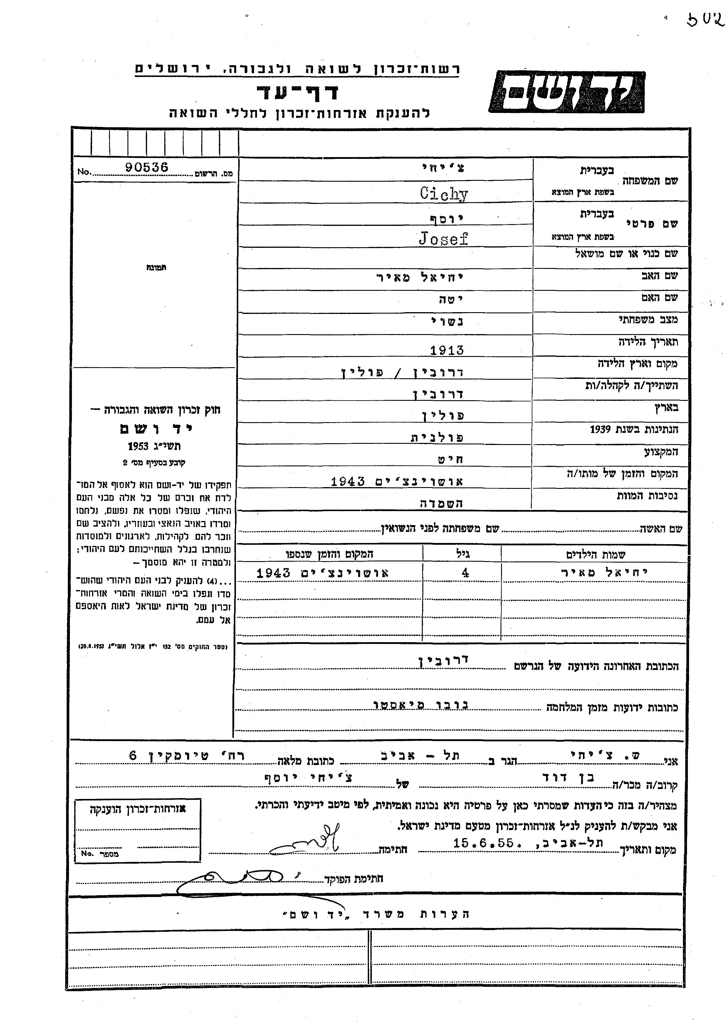 Yekhiel Meir Cichy Chekhi was born to Josef. He was child. Prior to WWII he lived in Drobin, Poland. During the war he was in Nowa Wilejka, Poland.
