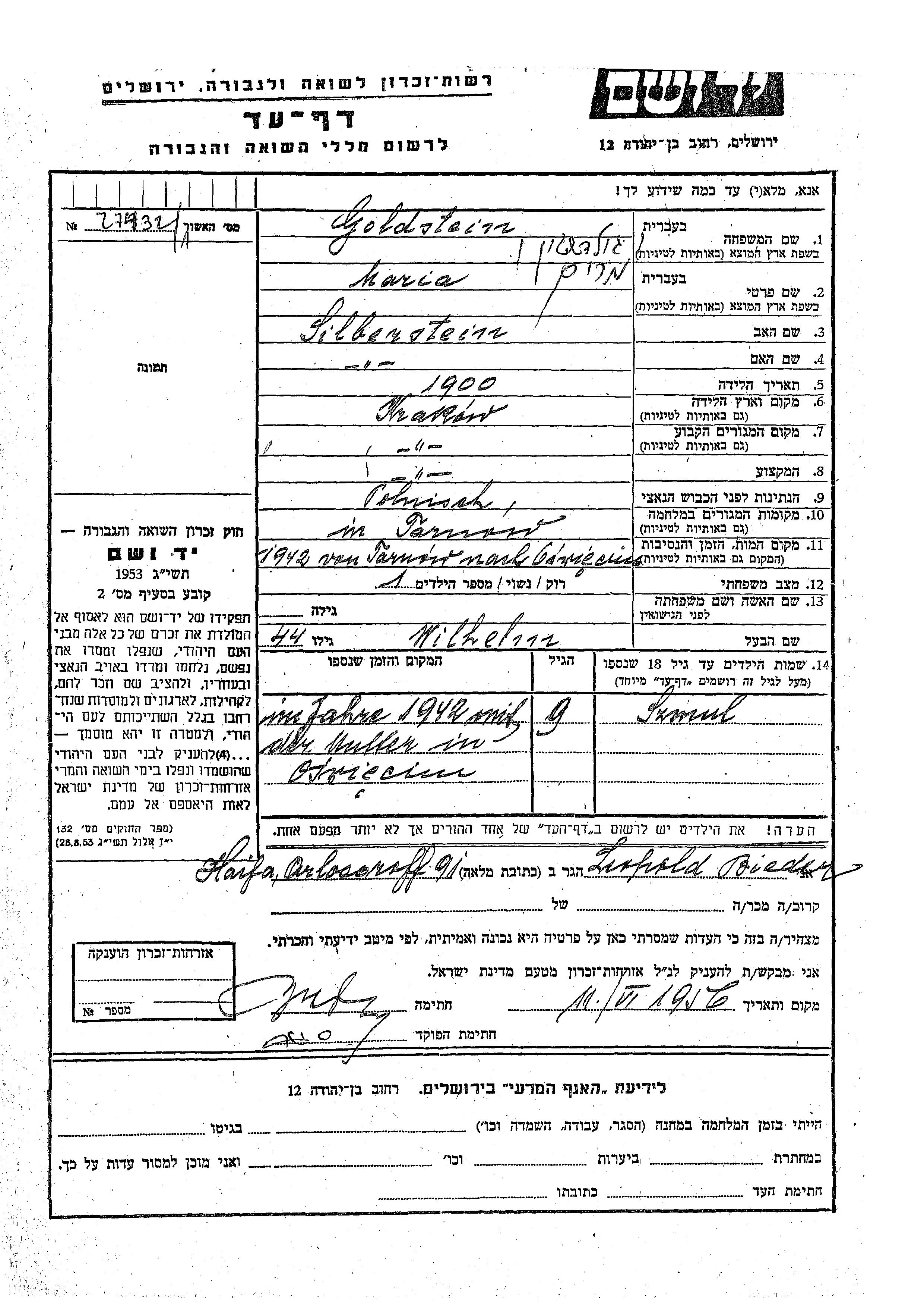 Szmul Goldstein was born to Wilhelm and Maria Miriam nee Silberstein. He was child. Prior to WWII he lived in Krakow, Poland. During the war he was in Tarnow, Poland. Szmul was murdered in the Shoah.