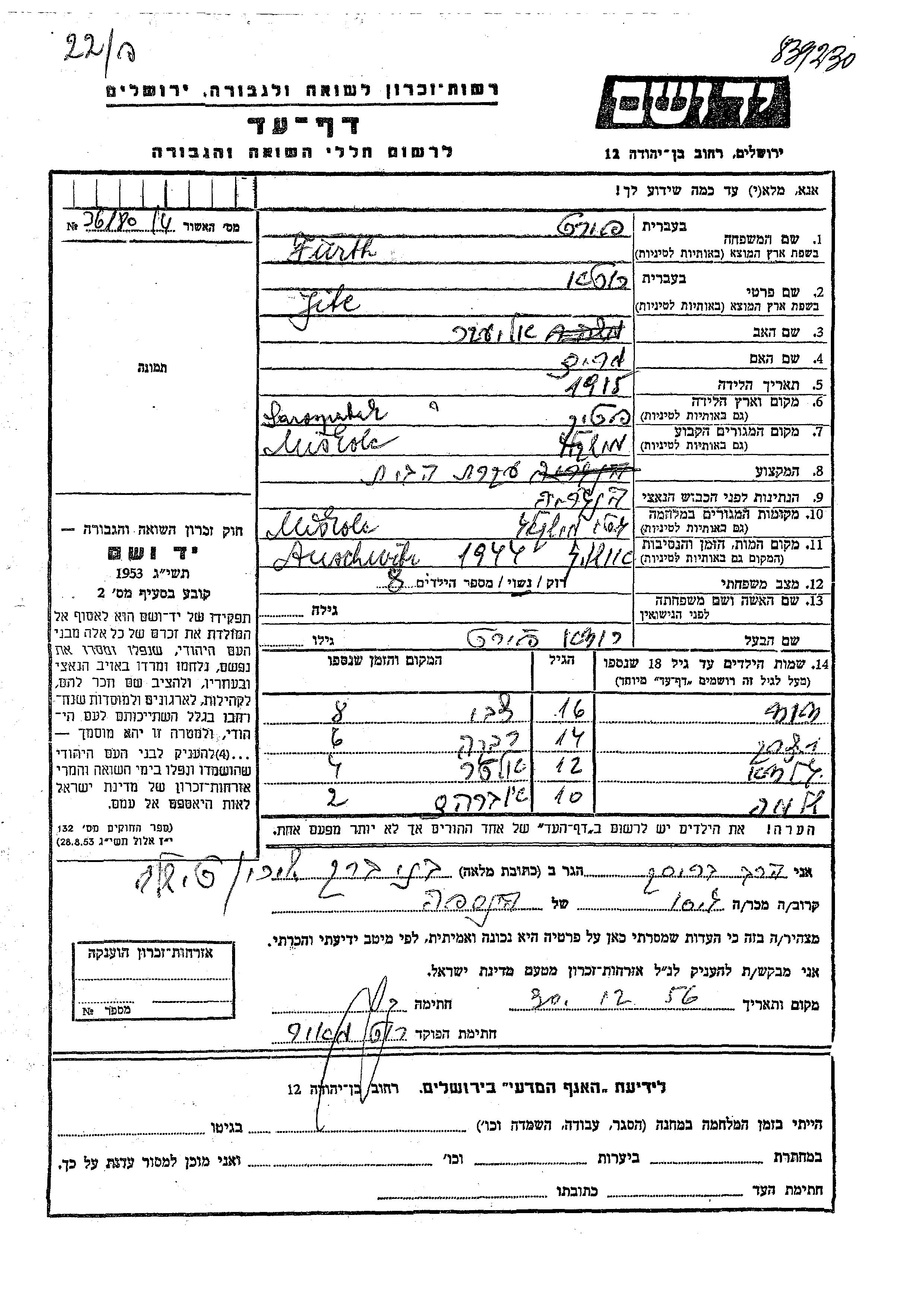 Yad Vashem - Pages of Testimony Names Memorial Collection