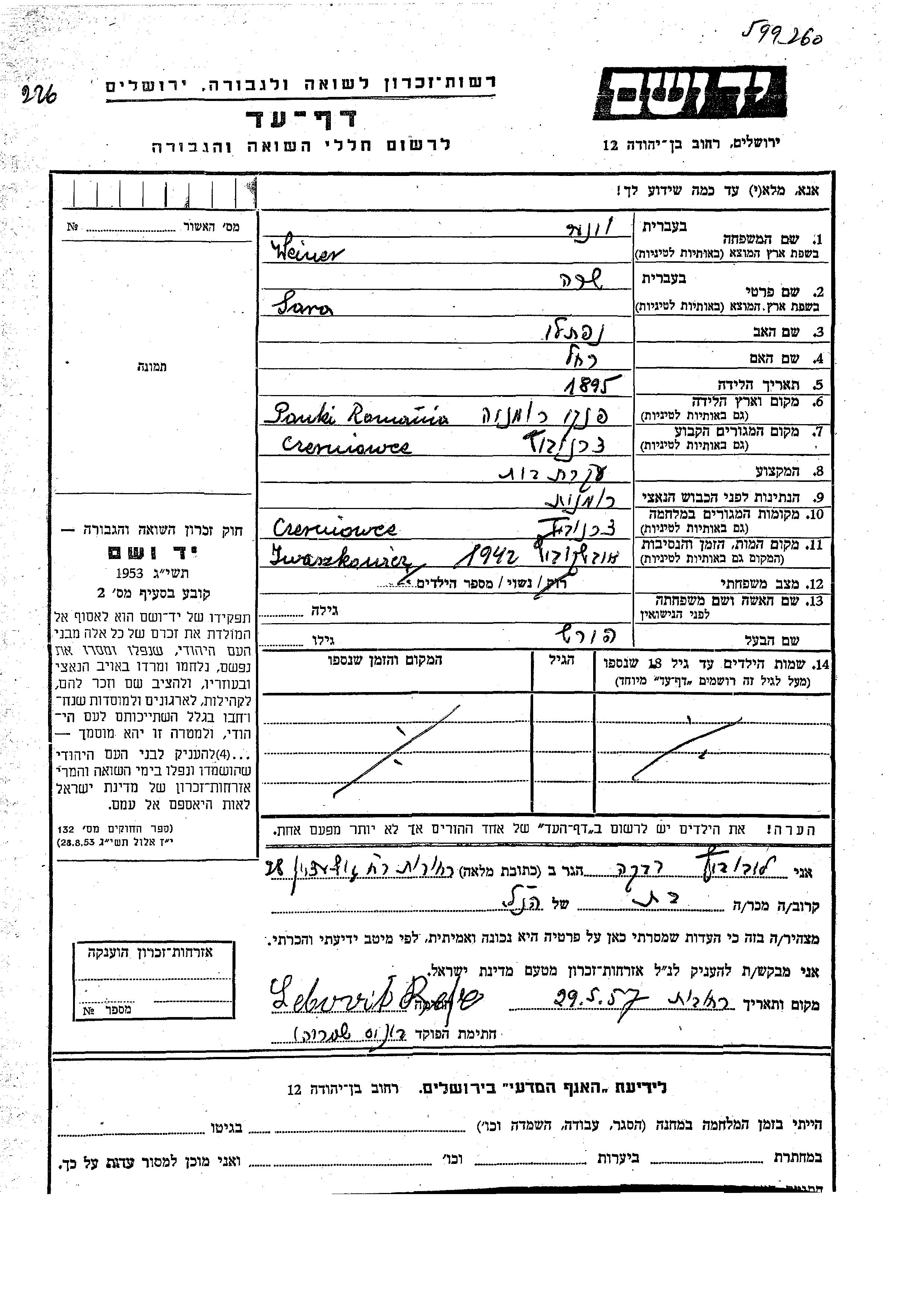 Weiner Sara 1895 Cernauti, Romania Page of Testimony