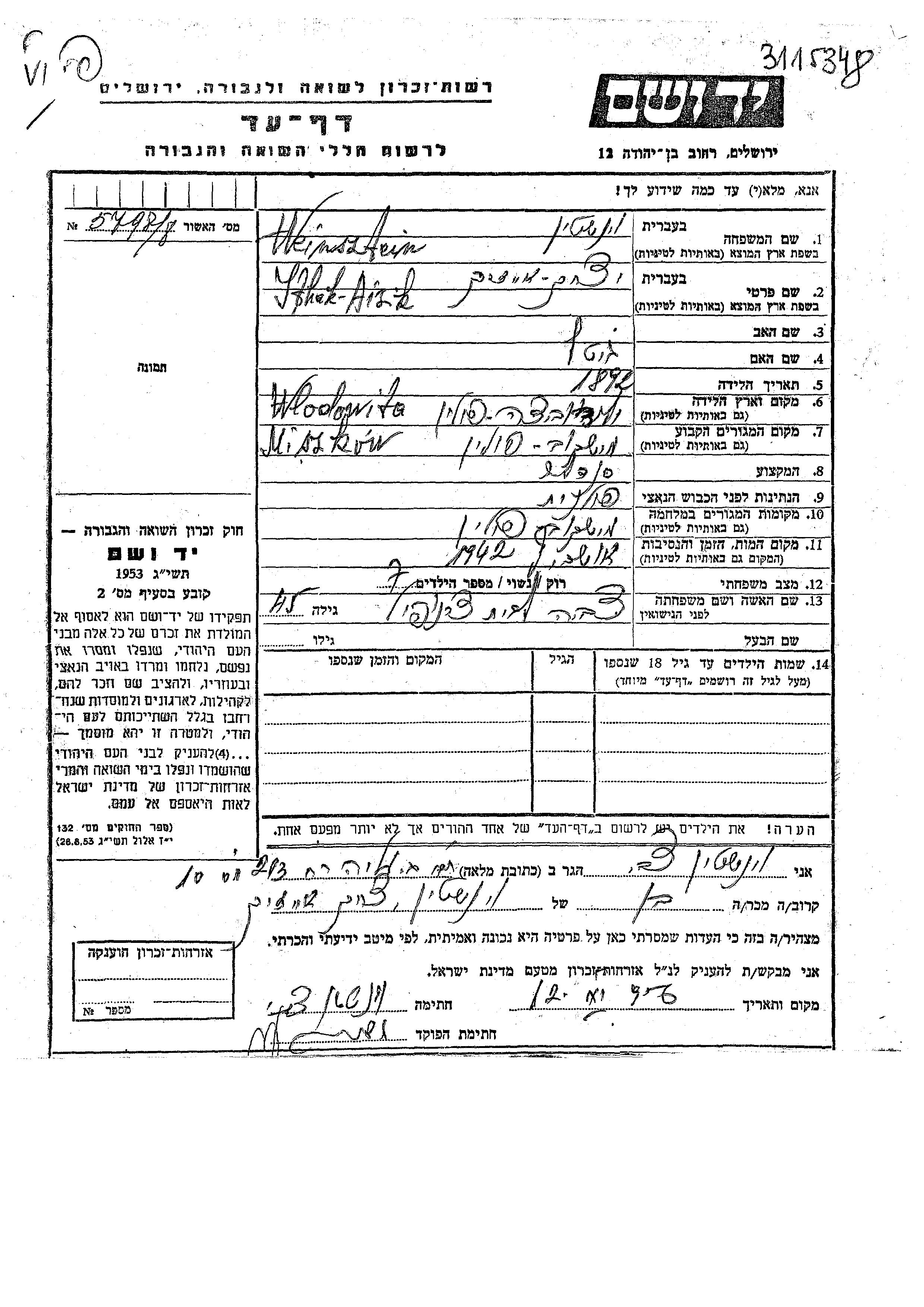 Izhak Weinsztein was born in Wlodowice, Poland, 1892 to Gitel. He was a shoemaker and married to Tzvia nee Charnopol. Prior to WWII he lived in Miszkow, Poland. During the war he was in Miszkow, Poland. Izhak was murdered in the Shoah. Place of death: Auschwitz, Poland, 1942.