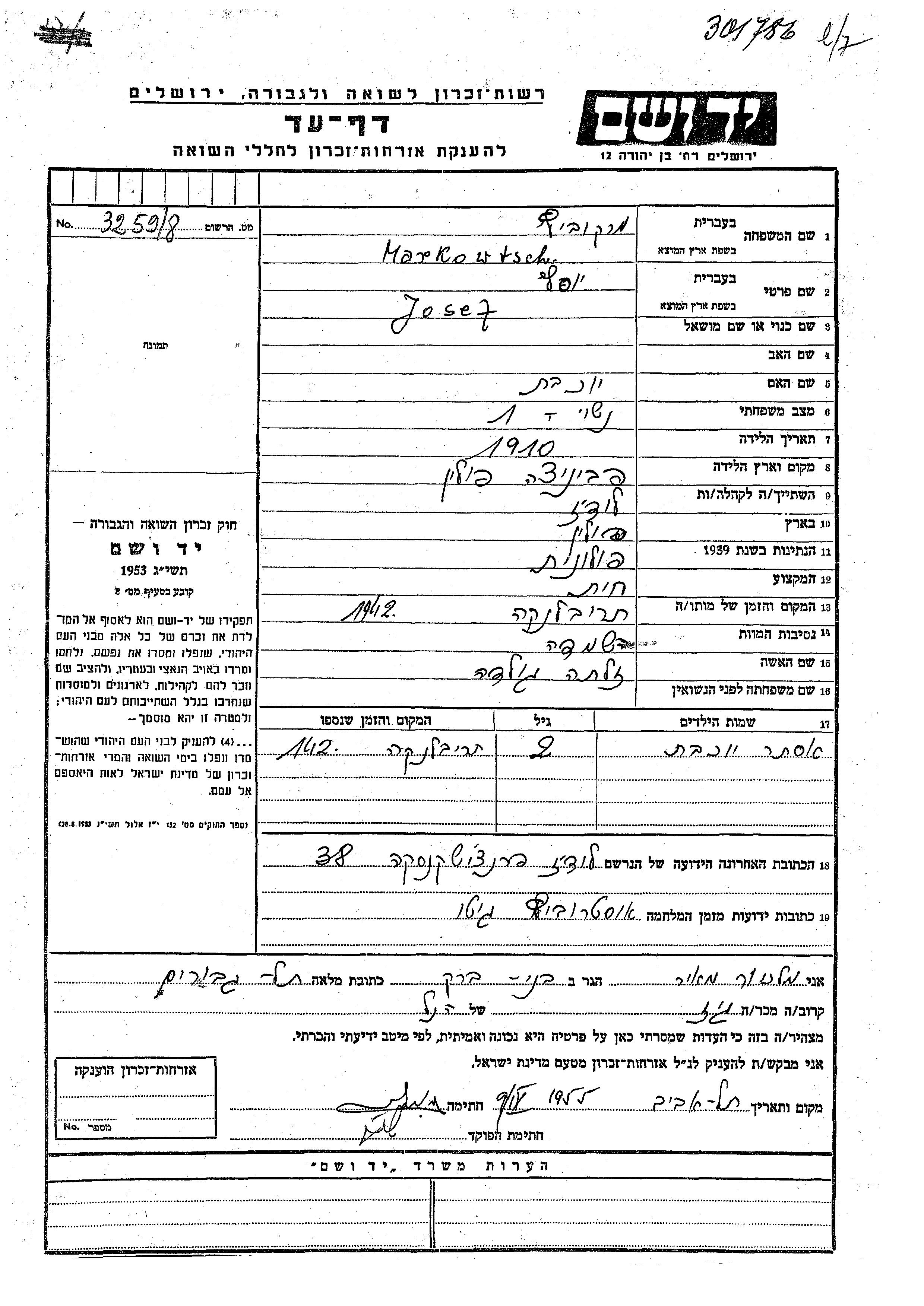 Ester Iokhevet Markowitsch was born to Josef and Zlata Golda. She was child. Prior to WWII she lived in Lodz, Poland. During the war she was in Ostrowiec, Poland. Ester Iokhevet was murdered in the Shoah.