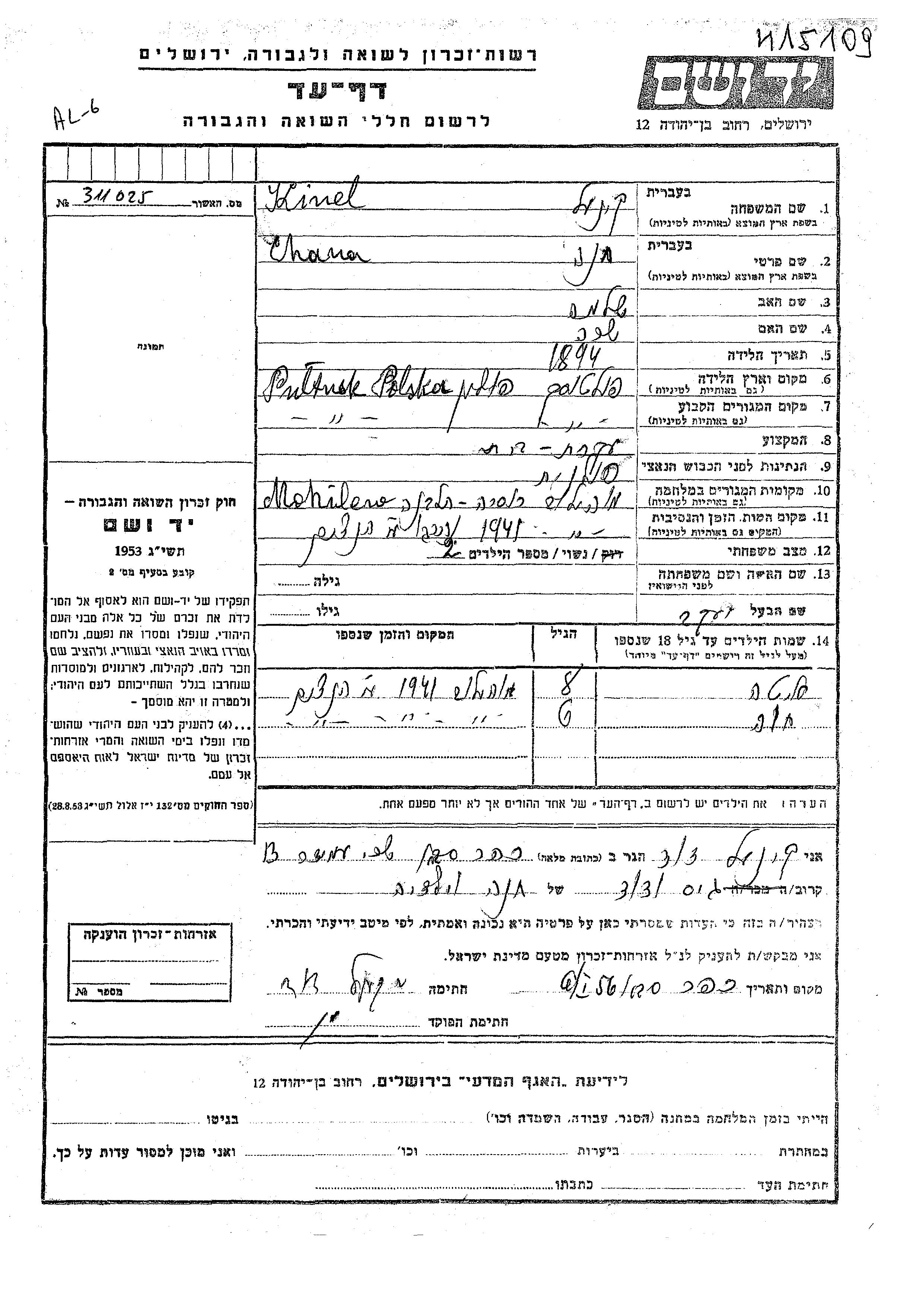 Yad Vashem - Pages of Testimony Names Memorial Collection