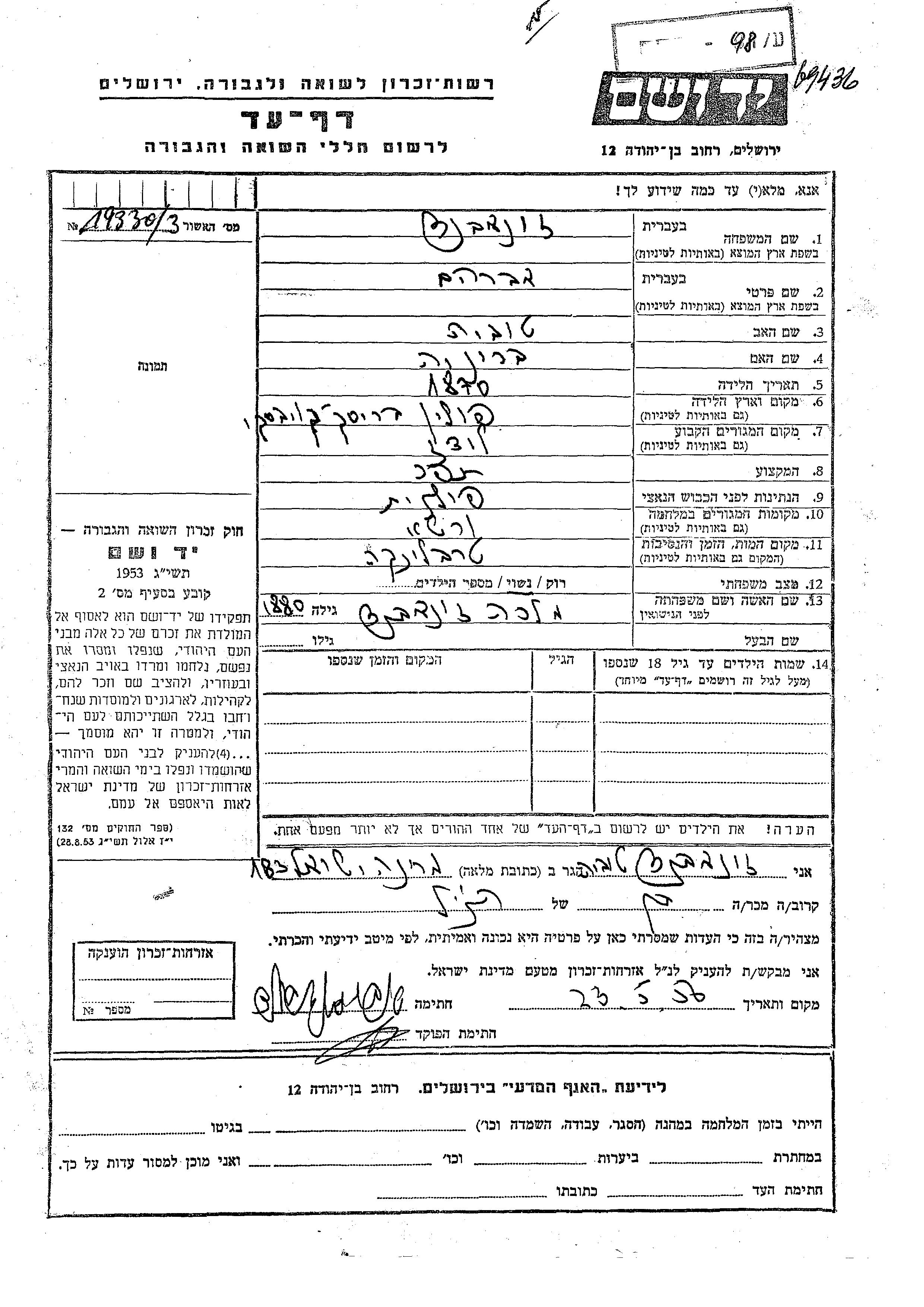 Avraham Zonabend was born in Brzesc Kujawski, Poland, 1870 to Tuvia and Bronia. He was a tailor and married to Malka. Prior to WWII he lived in Lodz, Poland. During the war he was in Warsaw, Poland. Avraham was murdered in the Shoah. Place of death: Treblinka, Poland.