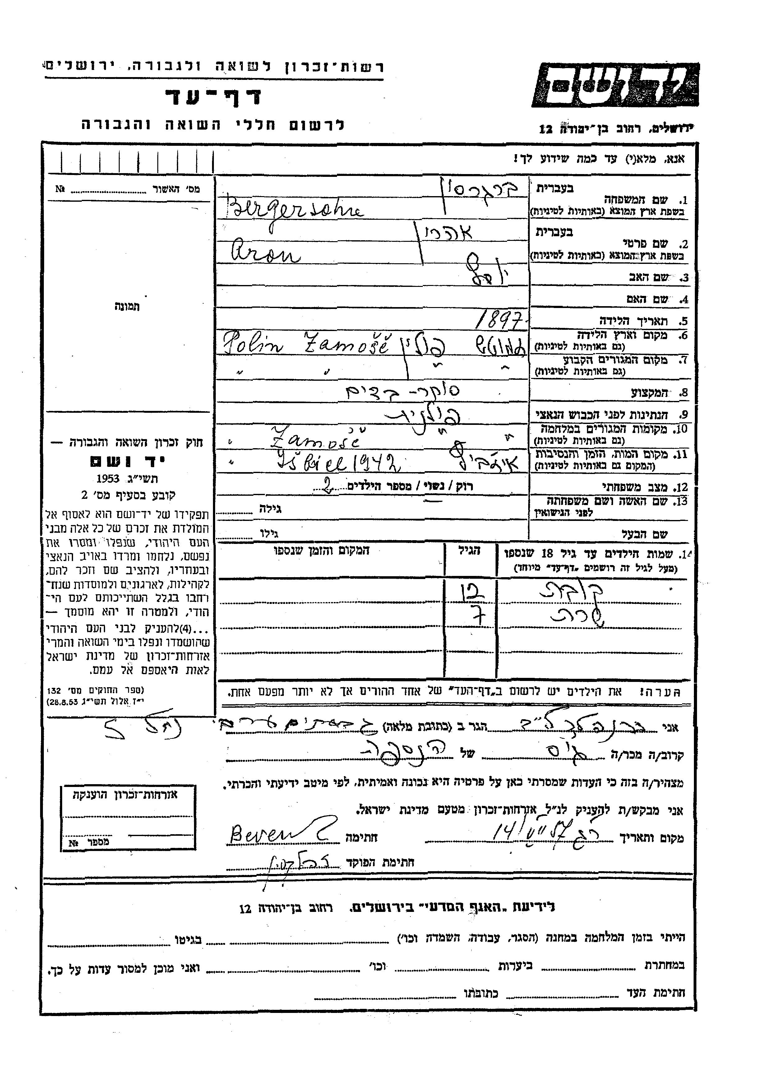 Bergersohn Sara Zamosc, Poland Page of Testimony