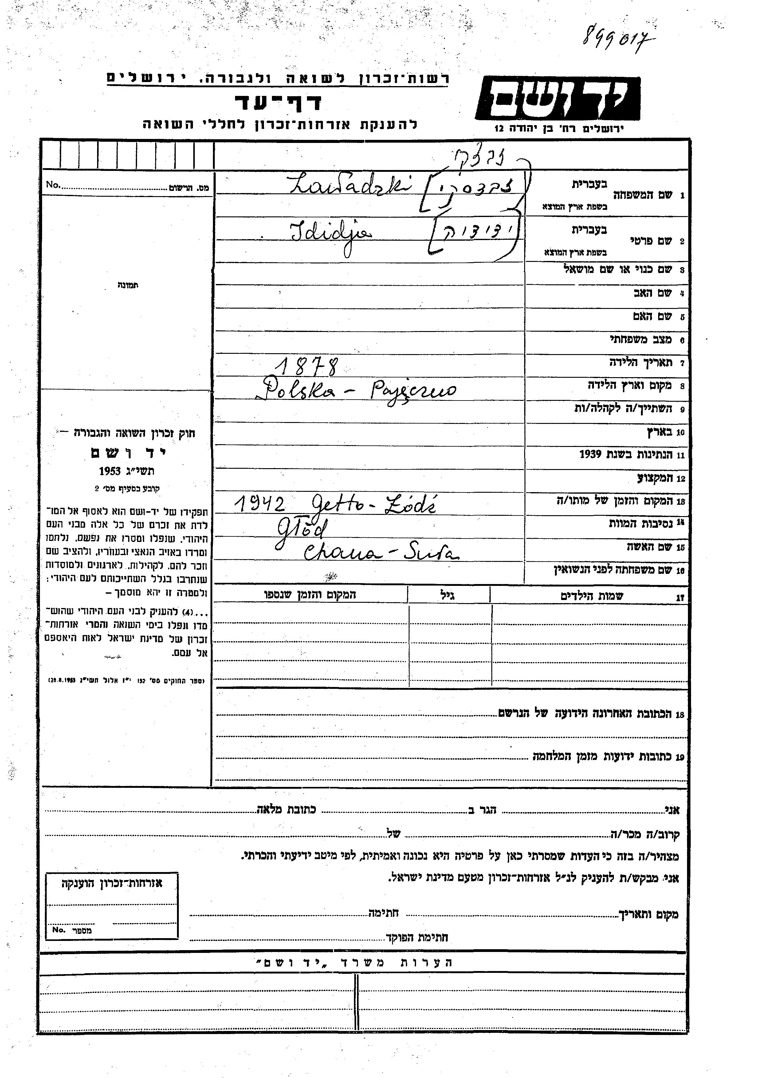 Jdidja was murdered in the Shoah. Place of death: Lodz, Poland, 1942.