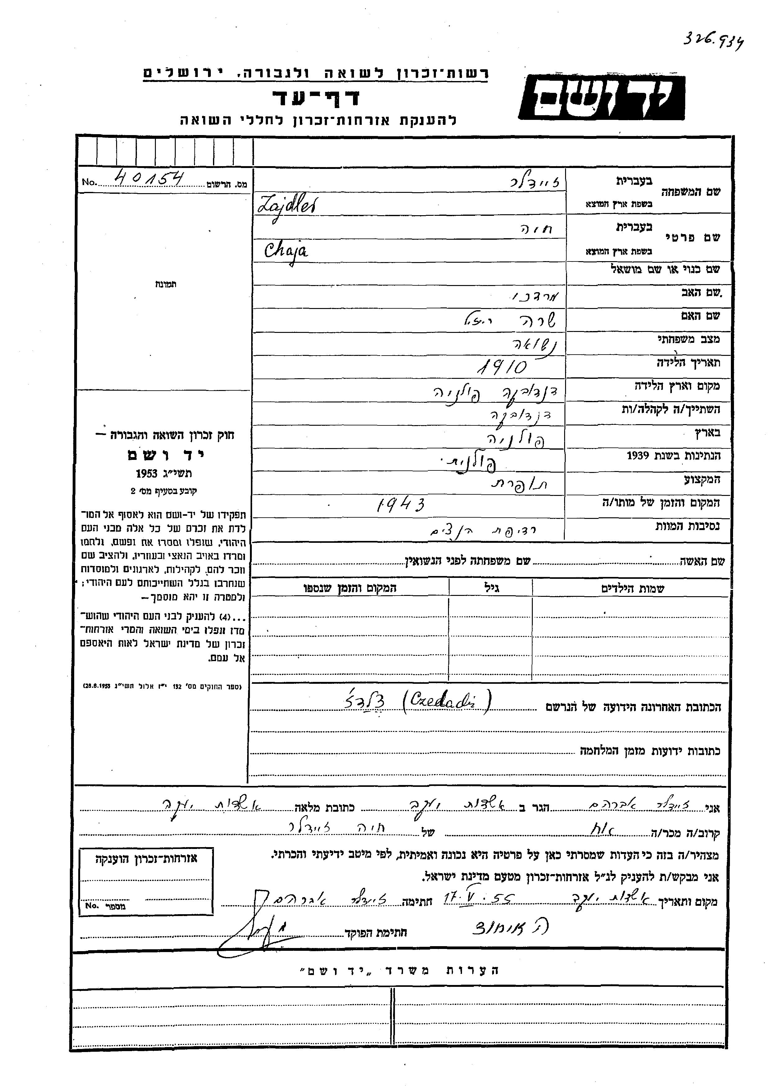 Zajdler Chaja 1910 unstated place, Page of Testimony