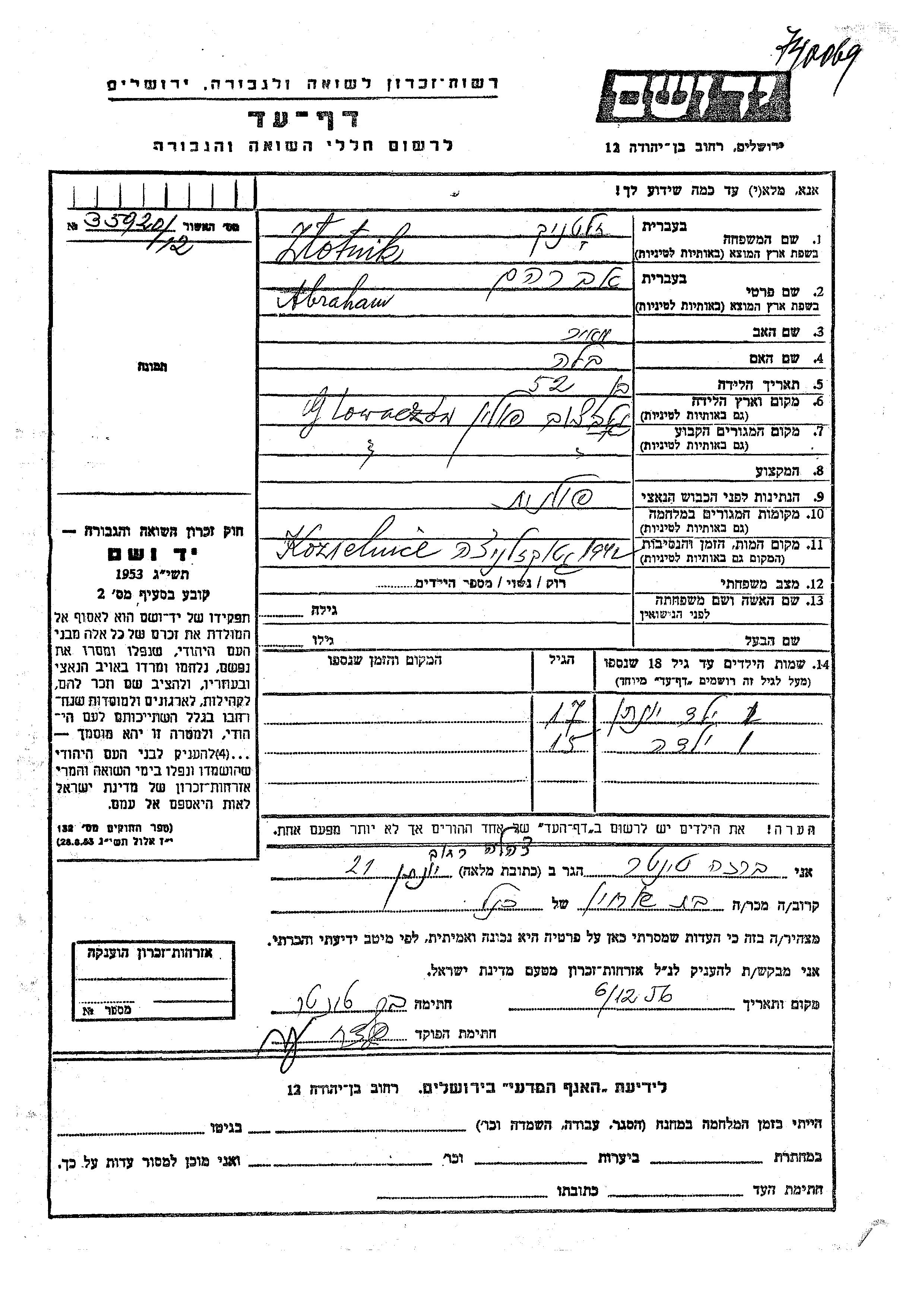 Abraham Zlotnik was born in Glowaczow, Poland to Meir and Bela. He was married. Prior to WWII he lived in Glowaczow, Poland. Abraham was murdered in the Shoah. Place of death: Kozienice, Poland, 1942.