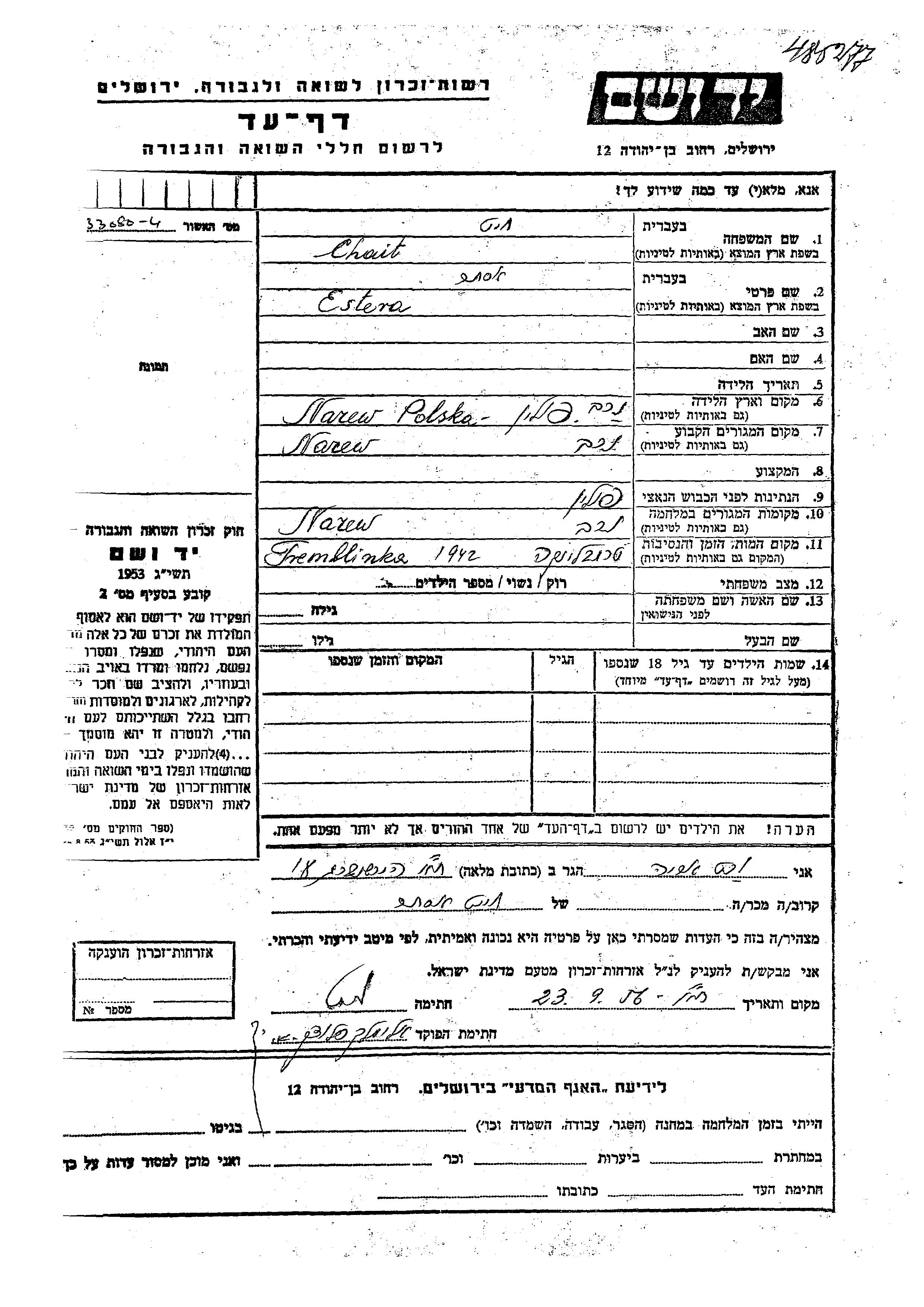 Estera Chait was born in Narew, Poland. She was single. Prior to WWII she lived in Narew, Poland. During the war she was in Narew, Poland. Estera was murdered in the Shoah. Place of death: Treblinka, Poland, 1942.