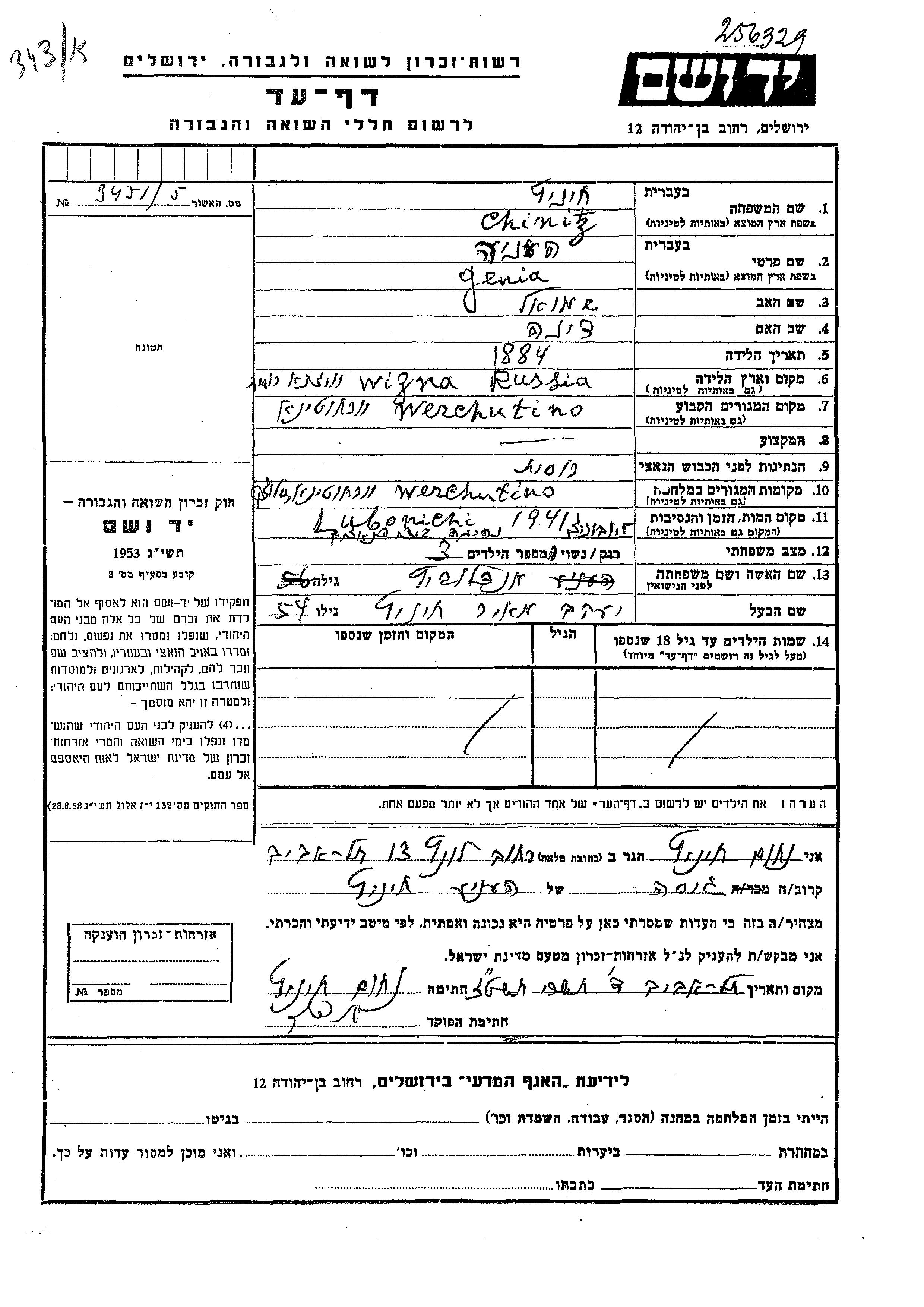 Genia Henia Chinitz nee Mendlovitz was born in Wizna, Poland, 1884 to Shmuel and Dina. She was married to Yaakov Meir. Prior to WWII she lived in Verkhutino, Belorussia (USSR). During the war she was in Verkhutino, Belorussia (USSR). Genia Henia was murdered in the Shoah. Place of death: Lyubonichi, Murder Site, 1941.