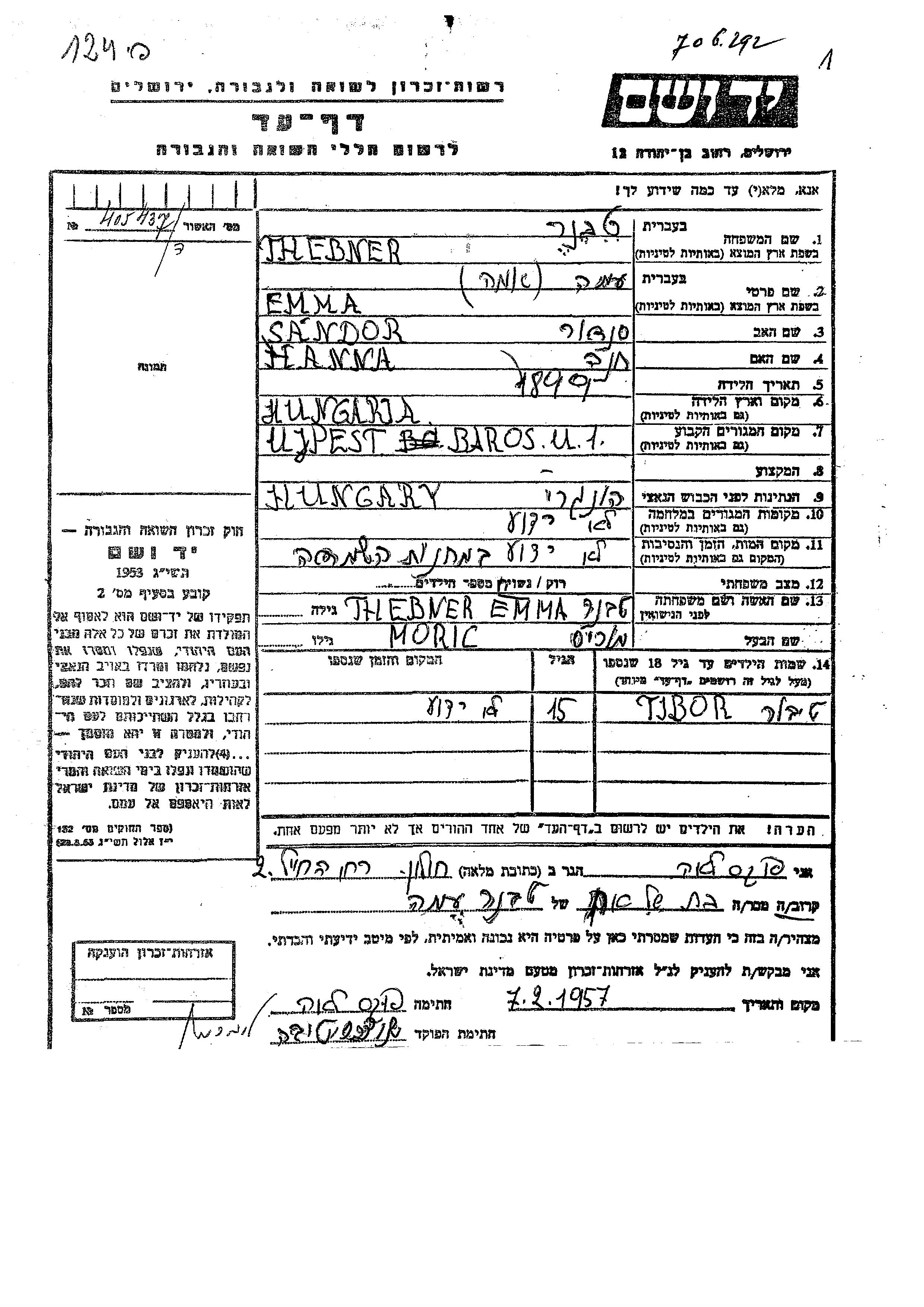 Thebner Tibor Ujpest, Hungary Page of Testimony
