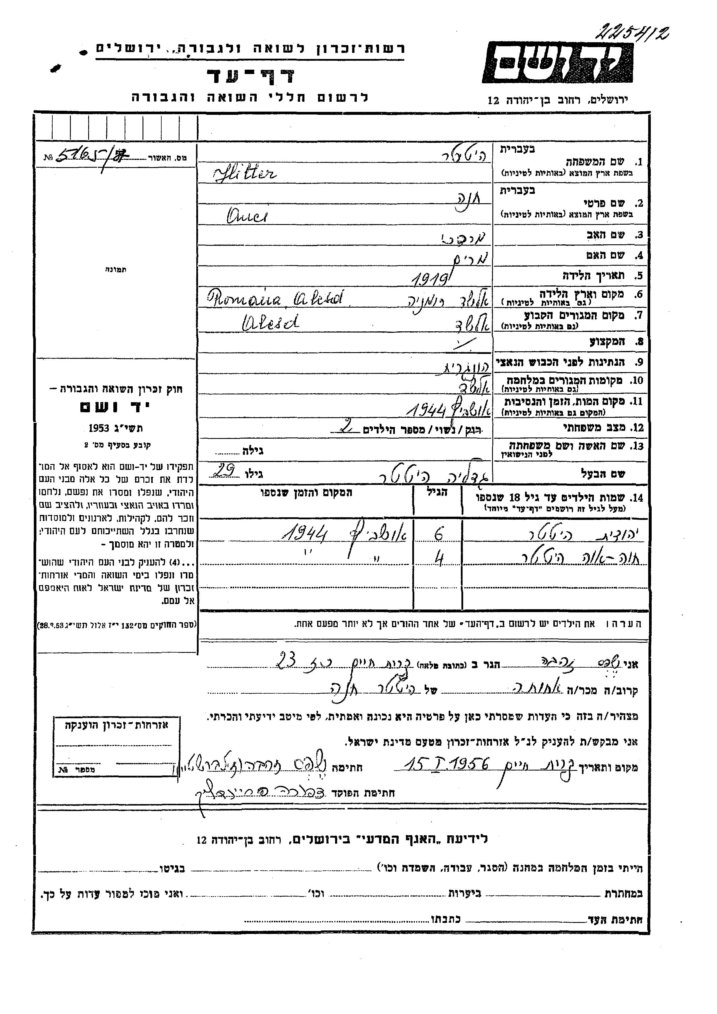Hitter Yehudit Alcedar, Romania Page of Testimony