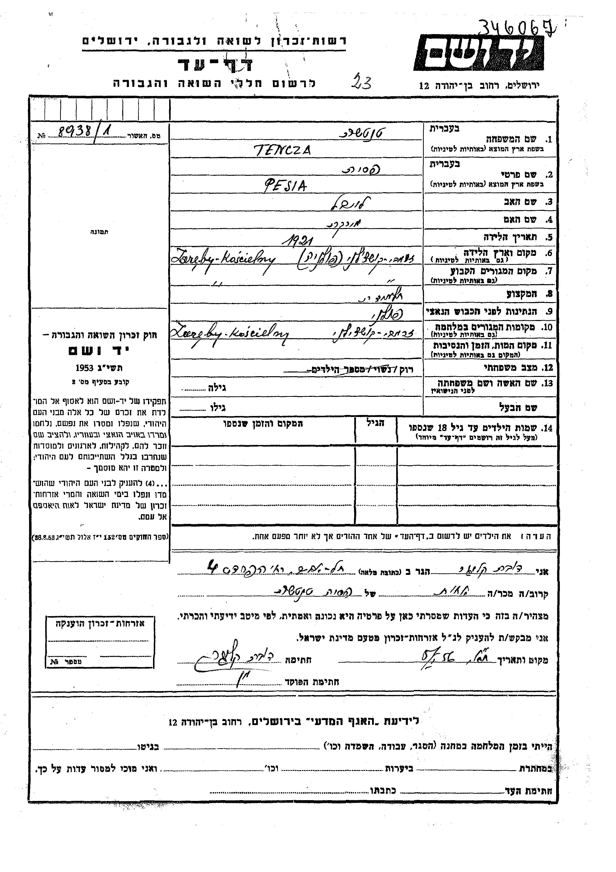 Pesia Tencza was born in Zareby Koscielne, Poland, 1921 to Leibel and Mirka. She was a pupil and single. Prior to WWII she lived in Zareby Koscielne, Poland. During the war she was in Zareby Koscielne, Poland. Pesia was murdered in the Shoah.