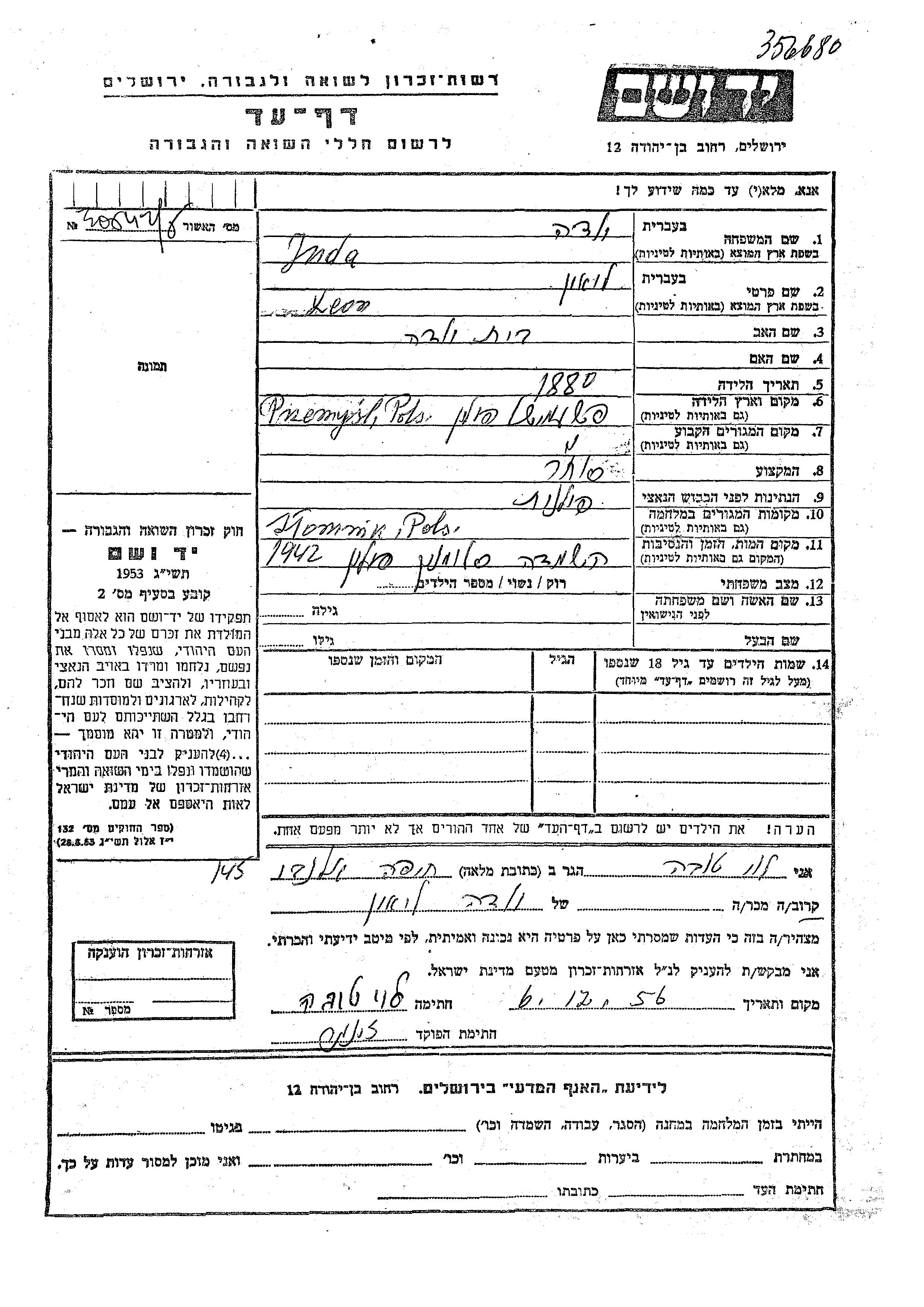 Lion Juda was born in Przemysl, Poland, 1880. He was a merchant. Prior to WWII he lived in Przemysl, Poland. During the war he was in Slomniki, Poland. Lion was murdered in the Shoah. Place of death: Slomnik, Poland, 1942.