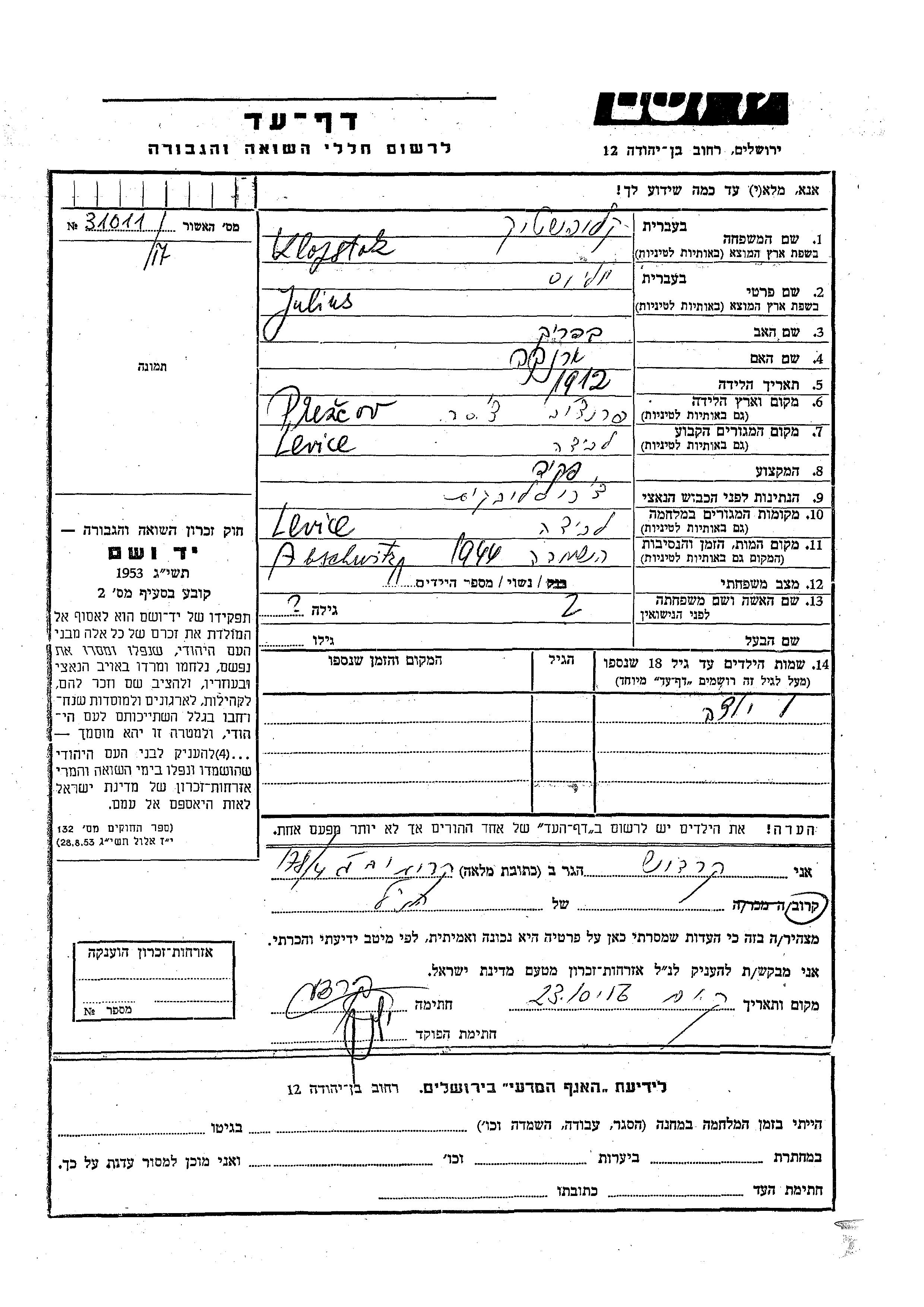 Klopstok Iuda Levice, Czechoslovakia Page of Testimony