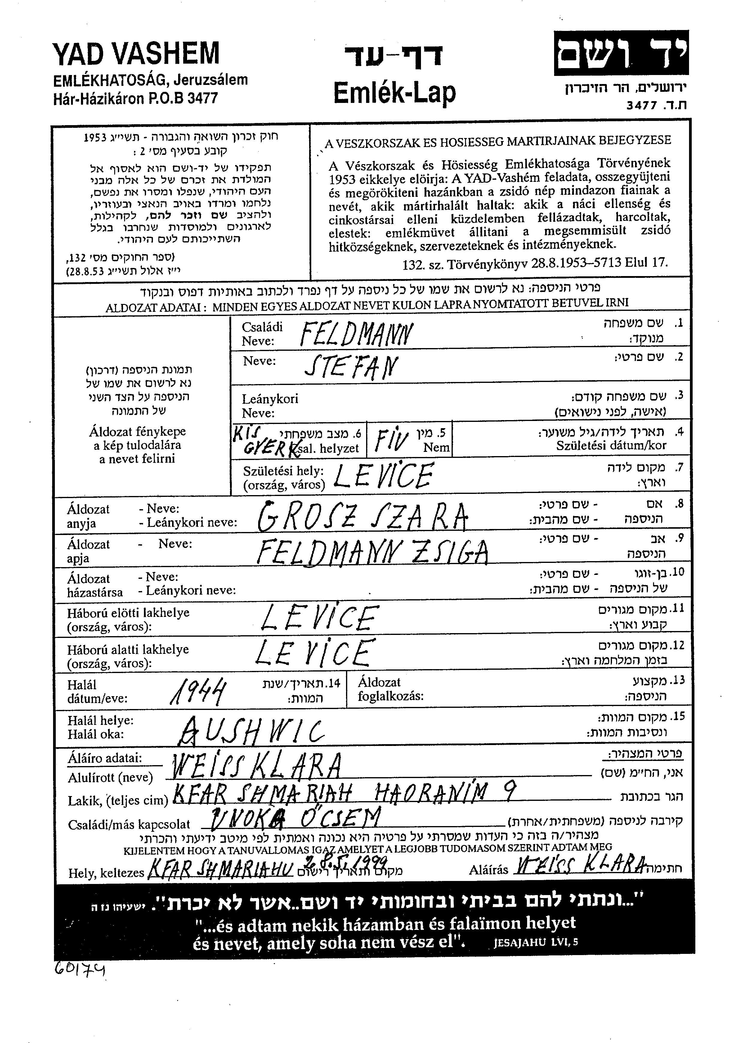 Feldman Shtefan Levice, Czechoslovakia Page of Testimony