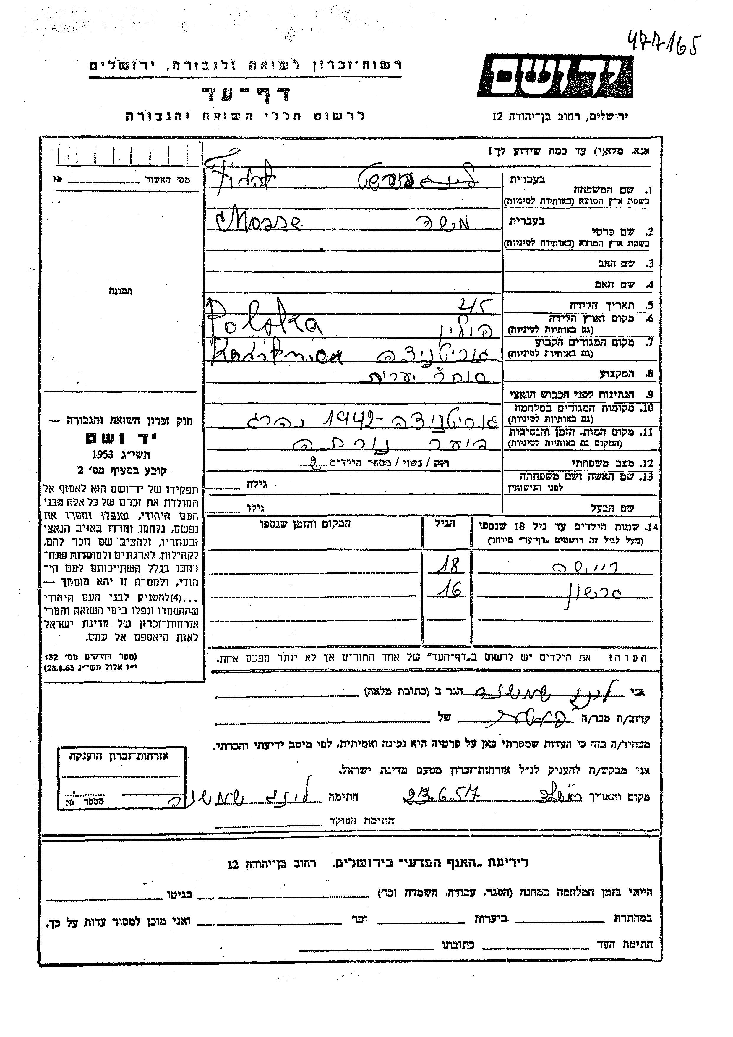 Yad Vashem - Pages of Testimony Names Memorial Collection