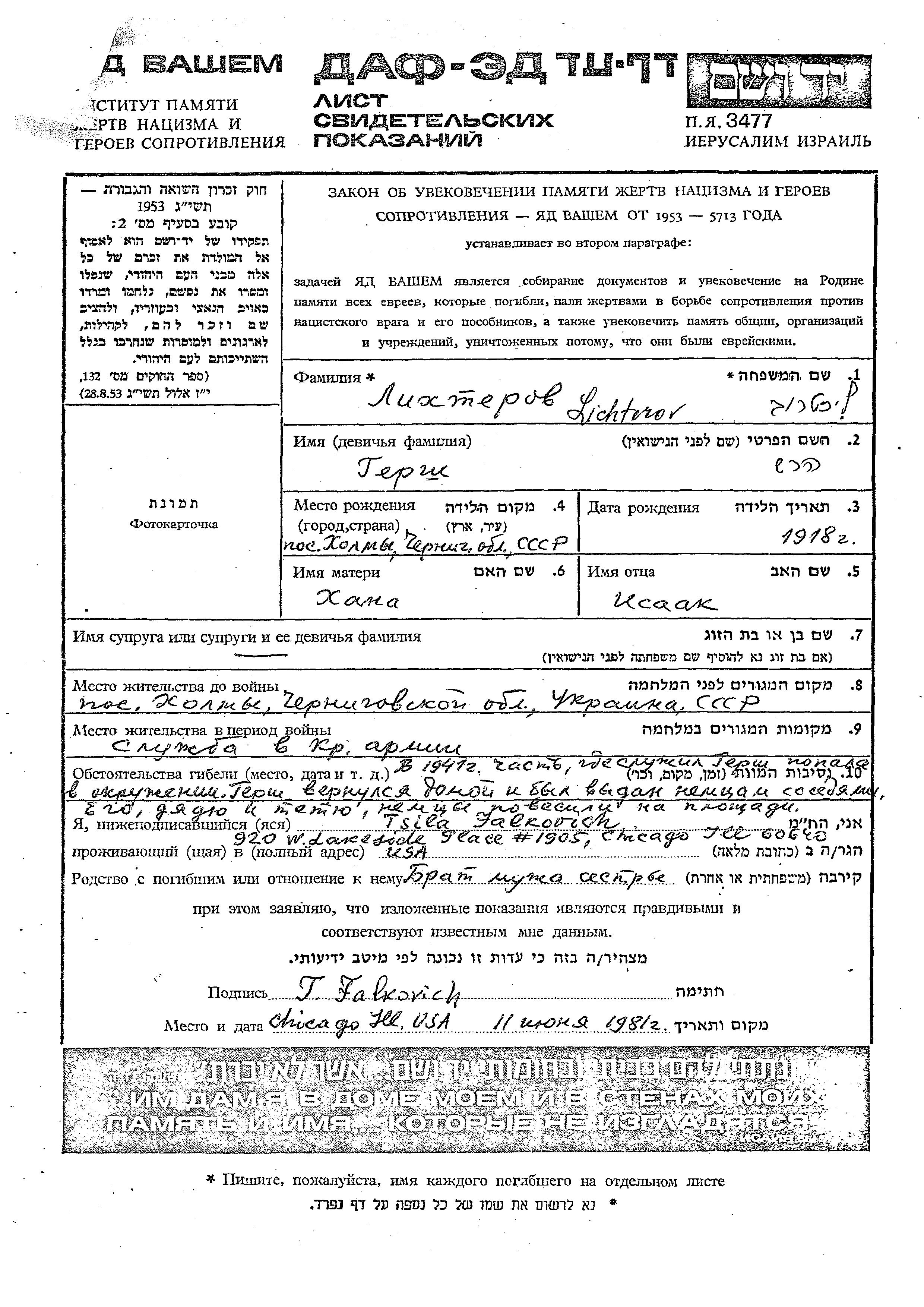 Gersh Lichterov was born in Kholmy, Ukraine (USSR), 1918 to Isaak and Khana. He was single. Prior to WWII he lived in Kholmy, Ukraine (USSR). During the war he was in the Soviet armed forces. Gersh was murdered in the Shoah. Place of death: Kholmy, Ukraine (USSR).