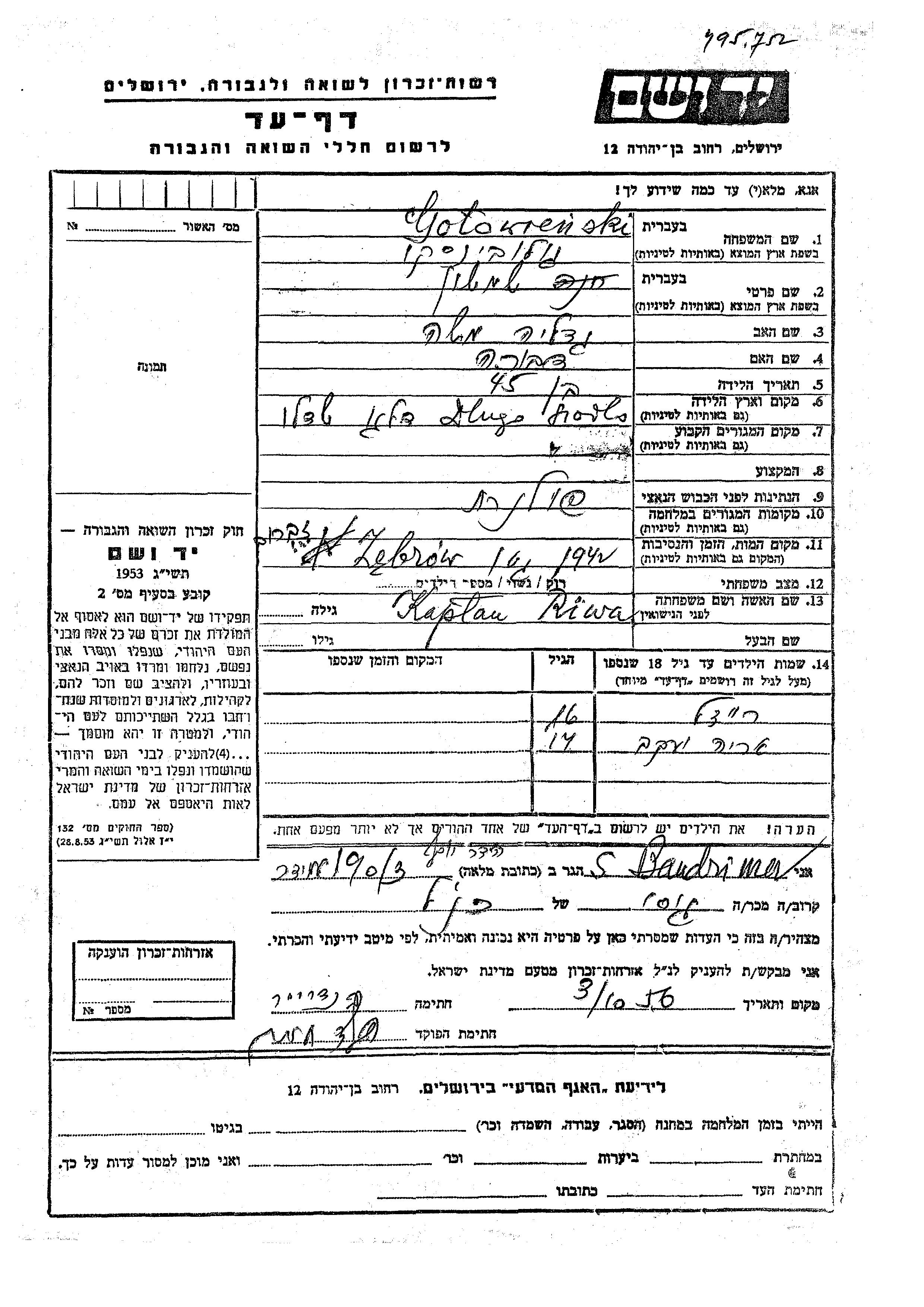 Yad Vashem - Pages of Testimony Names Memorial Collection