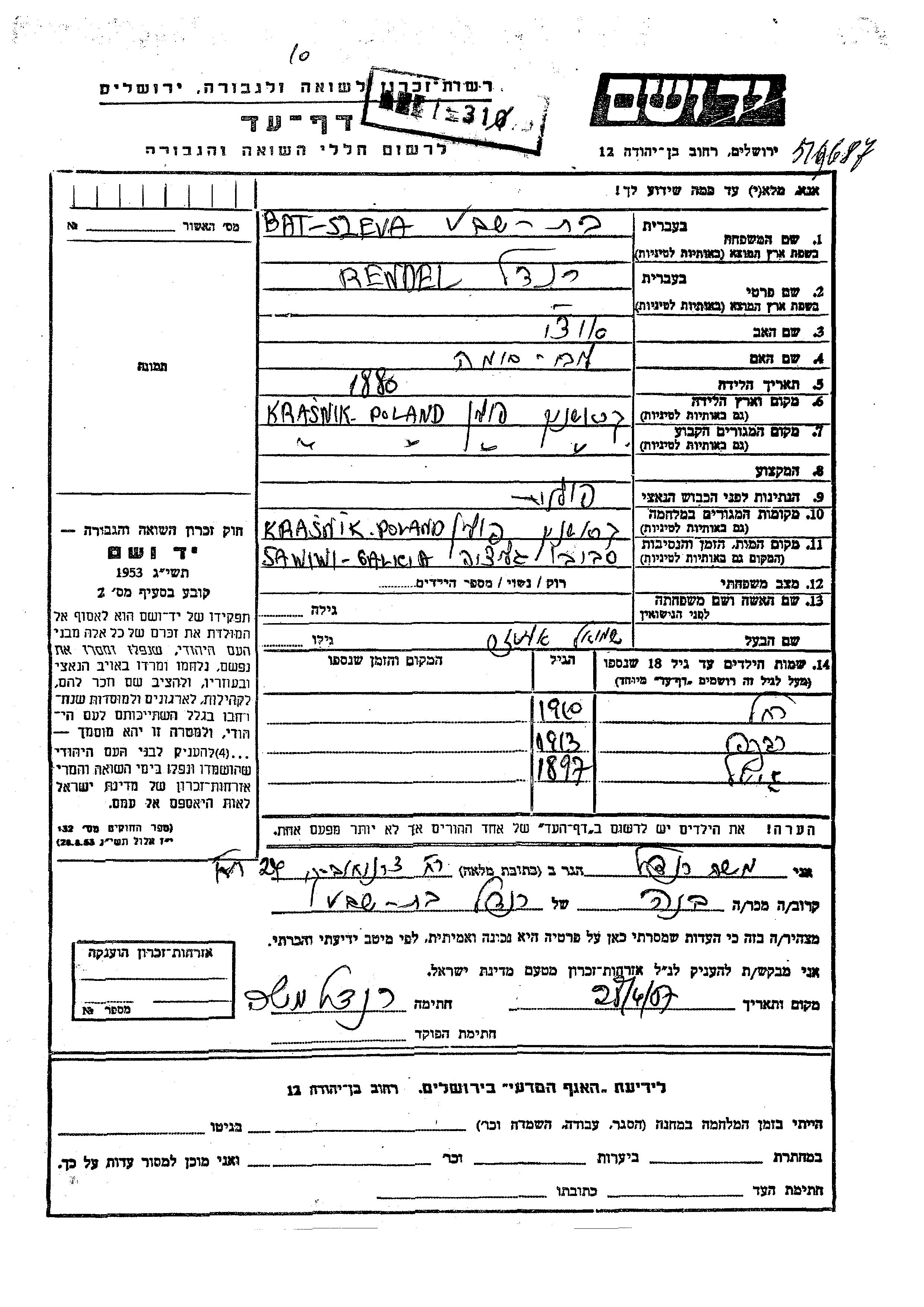 Yad Vashem - Pages of Testimony Names Memorial Collection