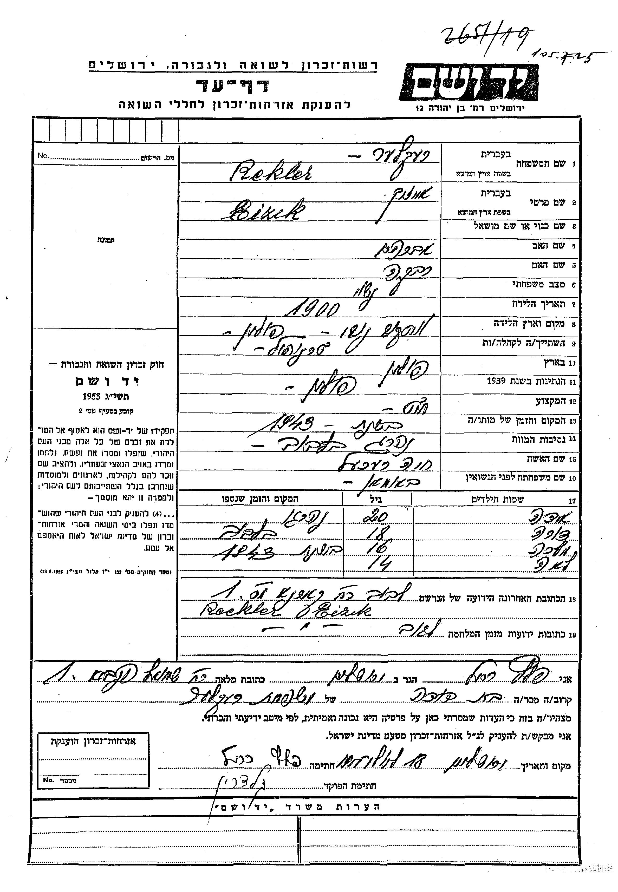 Rekler Malka Lwow, Poland Page of Testimony