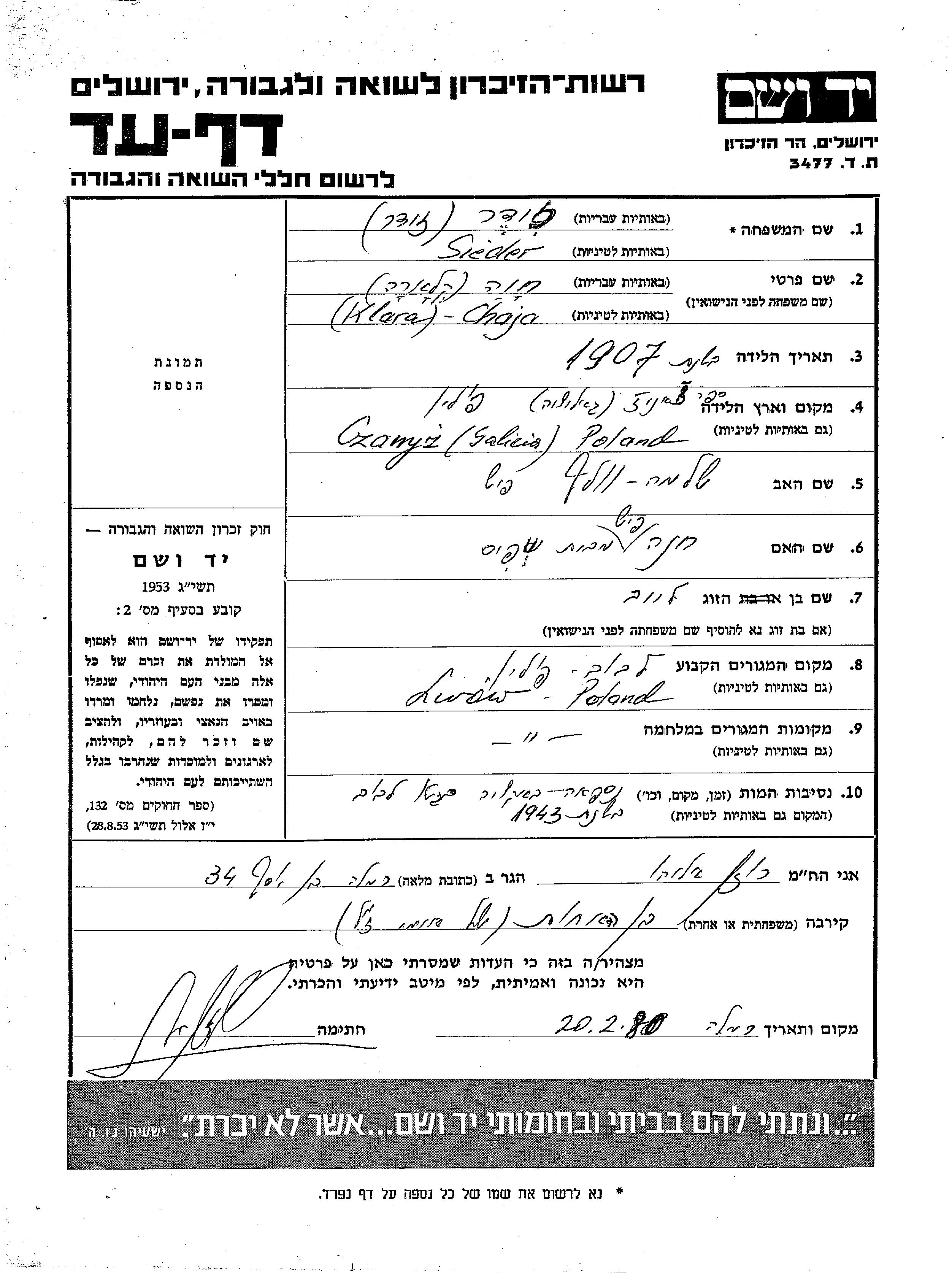 Chaja Klara Sieder nee Fish was born in Czanyz, Poland, 1907 to Shlomo Volf and Khana. Prior to WWII she lived in Lwow, Poland. During the war she was in Lwow, Poland. Chaja Klara was murdered in the Shoah. Place of death: Lwow, Poland, 1943.