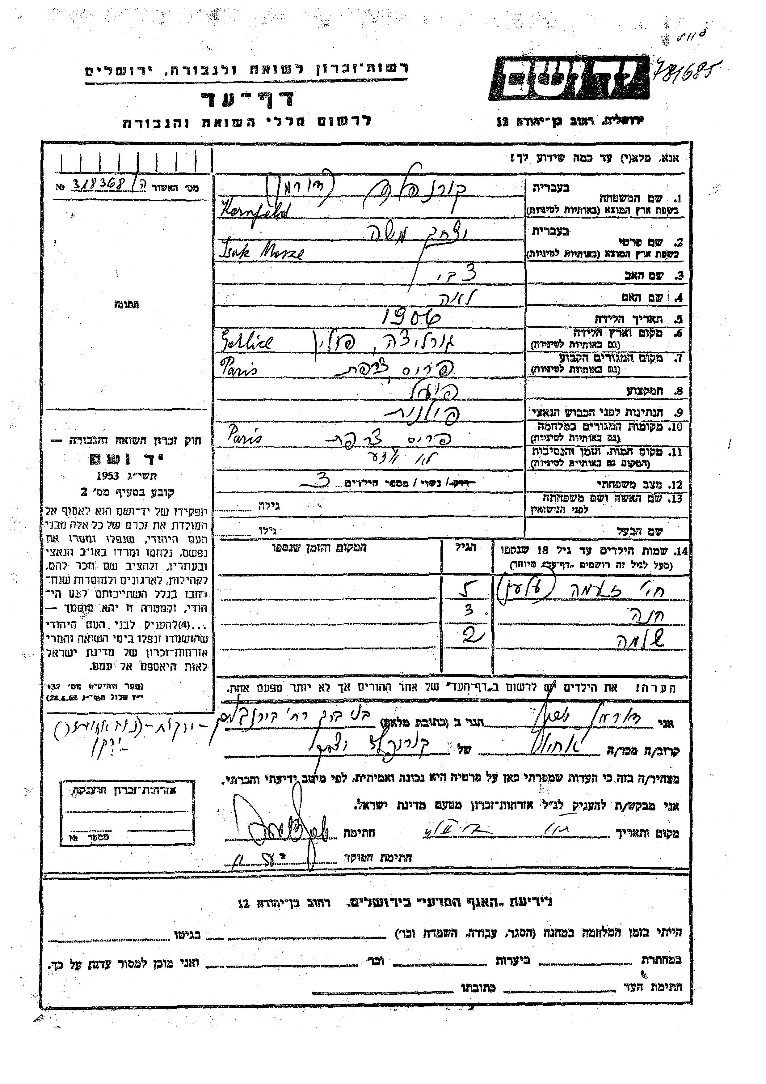 Kornfeld Shlomo Paris, France Page of Testimony