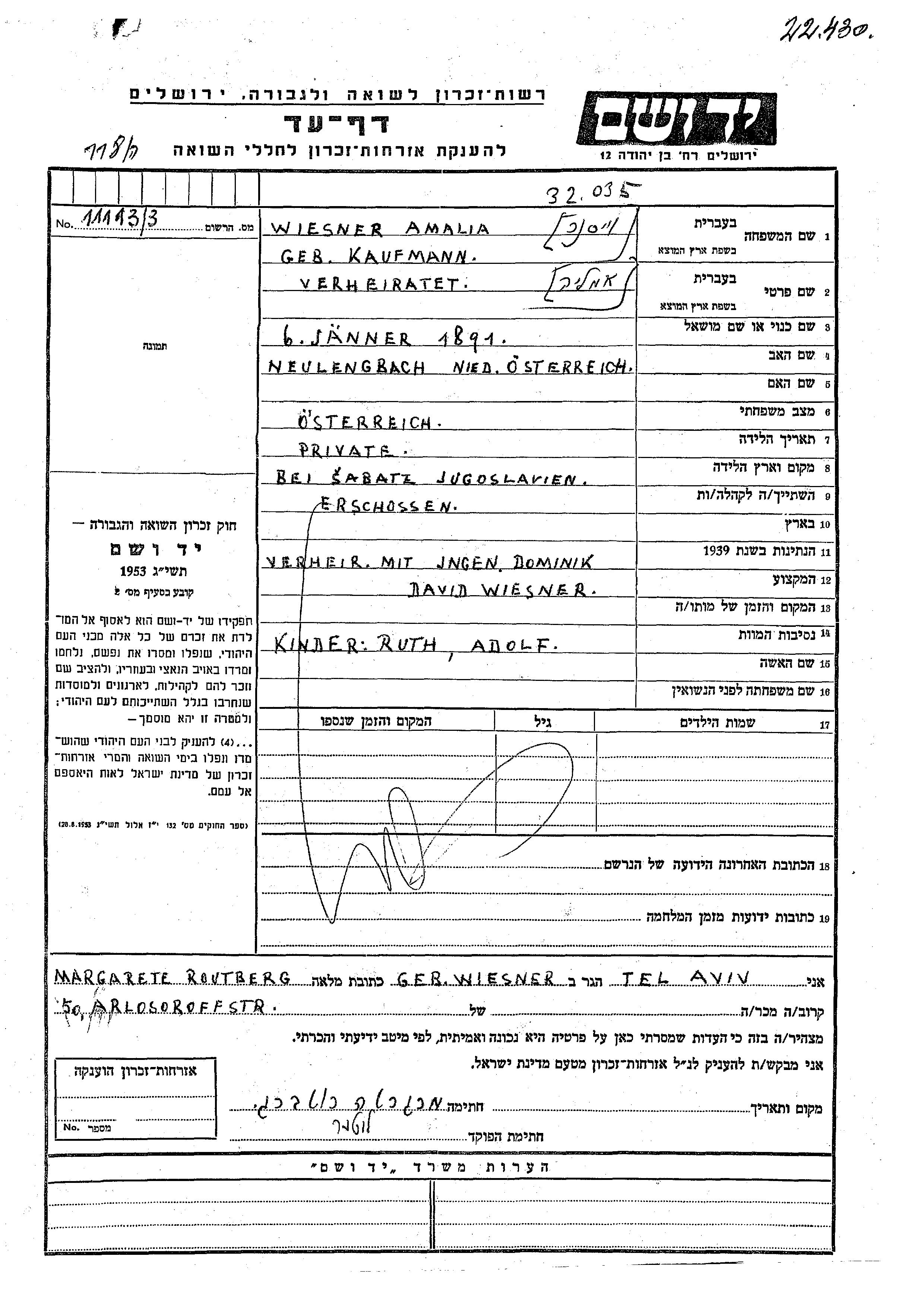 Adolf Wiesner was born to David Dominik and Amalia nee Kaufmann. He was child. Prior to WWII he lived in Austria.