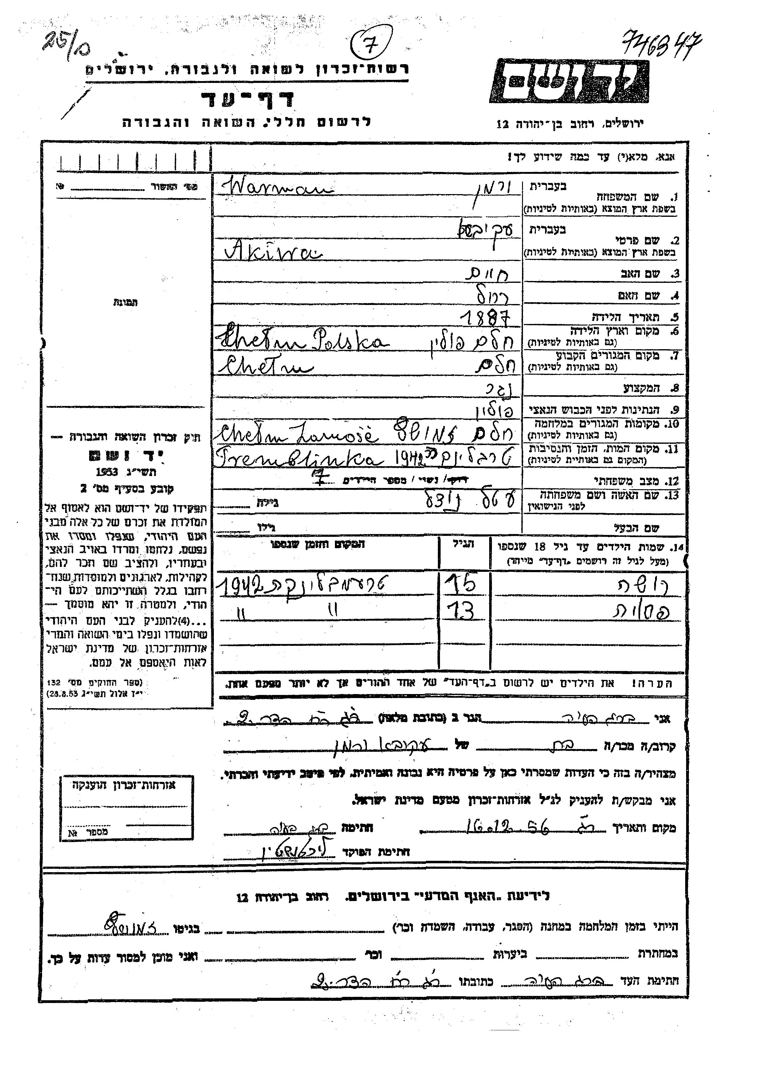 Warman Akiwa 1887 Chelm, Poland Page of Testimony