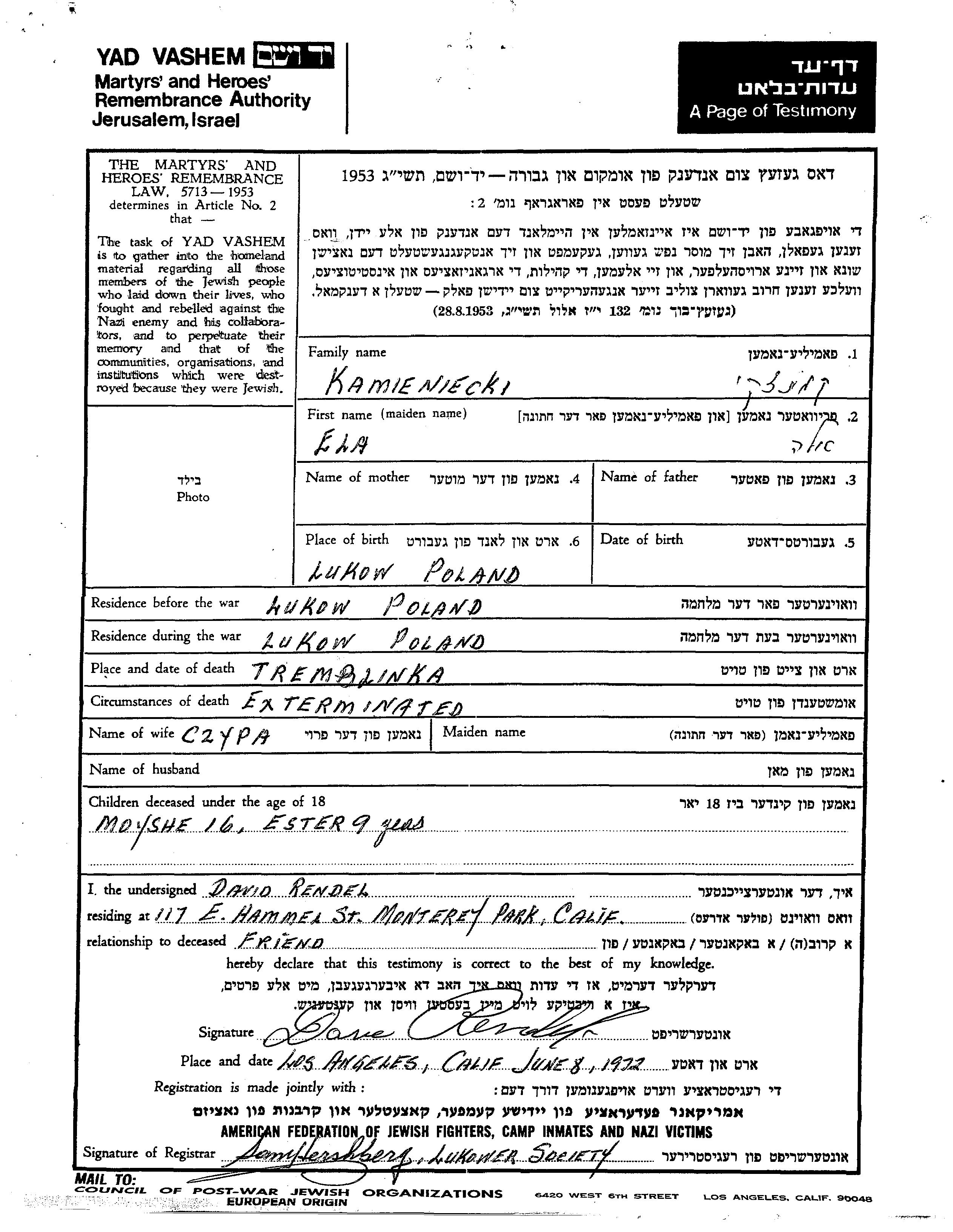 Kamieniecki Moyshe Lukow, Poland Page of Testimony